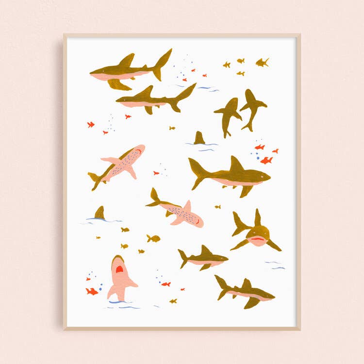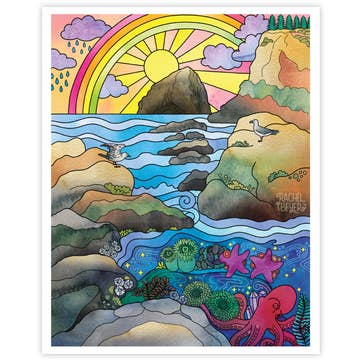Come, let us join the ocean life down amidst the colorful coral reefs as they enjoy some leisure time with one another. The young fish scouts have set up camp and have begun the marshmallow roasting, so do not be shy. The mermaids have been called to camp for campfire songs and octopus is pouring some hot tea. The sharks have mixed up some refreshing tropical drinks for everyone. You may notice some golf happening in the area and even some water polo and storytime for the baby urchins. The divers have been allowed to join everyone because they have brought some music for the axolotls to dance to. There is something for everyone down here in the coral recreational area, so please make yourself at home and bring your bubbles! - Signed and numbered limited edition print run of 250. - 13"x19"