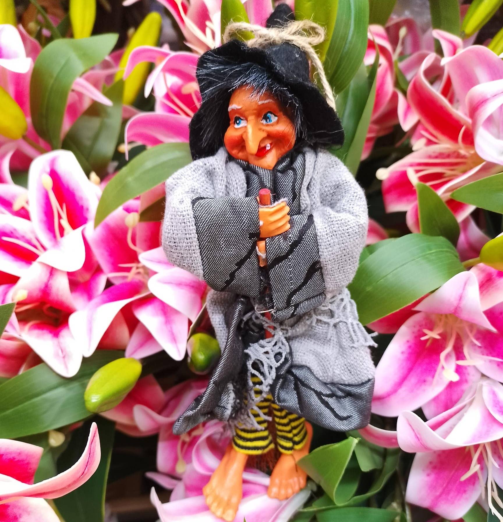 Tibetan monk hand made doll on wood stand; traditional dress and hat, holding rosary; hand painted face
