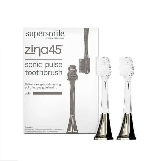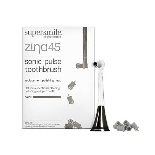 Supersmile Zina45™ is the next generation sonic toothbrush specifically designed to deliver the most professional cleaning + polishing experience at home. This brush is based on the same patented technology that Dr. Irwin Smigel, world renowned Father of Aesthetic Dentistry and Supersmile's founder, created. 4 custom professional settings: ultra clean: exceptional tooth + gum cleaning. sensitive clean: for sensitive teeth. stimu-gum: promotes healthy gums. super shine: polishes and brightens. Our patented 45° angled brush head. The polishing head. Improves gum health. Quadtimer + alert. 2-minute automatic shut off. Patented Ergonomic Handle. Touch magnetic charger. Deluxe Chromed Travel Case. Includes: 1 ergonomic handle, 1 beautiful magnetic touch charger with USB, 2 patented 45• angled brush heads, 1 unique polishing head, 6 polishing rubber cups replacements, 1 deluxe chromed travel case.