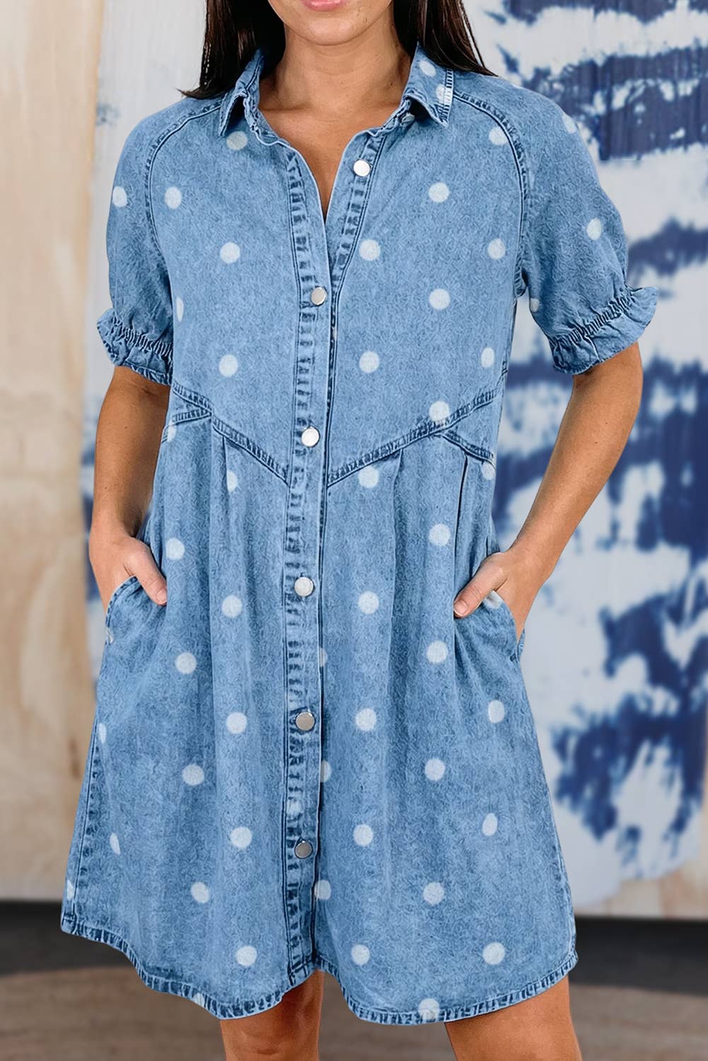 Ruffle Sleeves Pintuck Detail Polka Dot Print Mini Dress - Short flutter sleeves - Collared - Side pockets - Button-up front - Babydoll design
