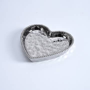 This Handcrafted Silver Edge Decor Heart Shaped Serving Piece is great for serving side dishes, snacks, candy or desserts, and looks great!-it is food safe but should be hand washed. Super gift for a loved one. Perfect For Valentines Day. Attractive and Practical Heart Shaped Serving Bowl Environmentally Sustainable All Natural Components Hand Wash Only - Food Safe Elegant Silver Metallic Heart Shaped Accent Serving Bowl Superb Wedding, Engagement or House Warming Gift