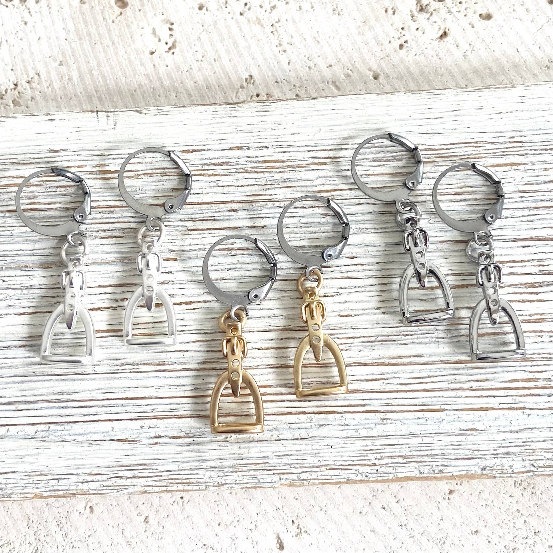 These are the Longer version of our cute stirrup earrings. Choose your colors, stainless steel Lever backs. The stirrups are 19 MM With an inch drop