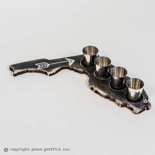 Drinks, sauces, soups and sweets take flight on this handmade wood state chalkboard drink tray. Glasses nest along the entire stretch of the state, painted with a distressed chalkboard finish so you can label the flight of flavors—or just a witty quip for guests. Either way, state pride never tasted so good. Includes 4 glasses per flight. Dimension: Approx. 12” with .5" rise Grace Graffiti™ is an American Made company. We design, make and ship all of our handcrafted products in our studio in Historic Downtown Brunswick, Georgia. All items are hand cut and given a distressed finish, accentuating the natural grain and charm of the wood. Each piece of wood is unique, items will vary slightly from the photographs.