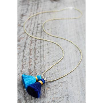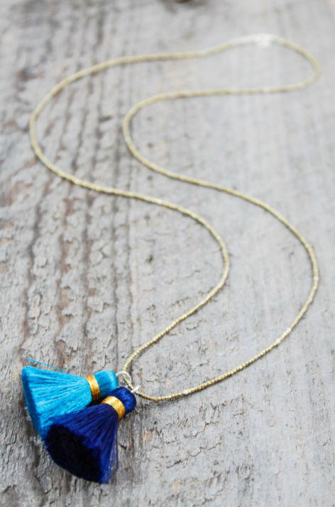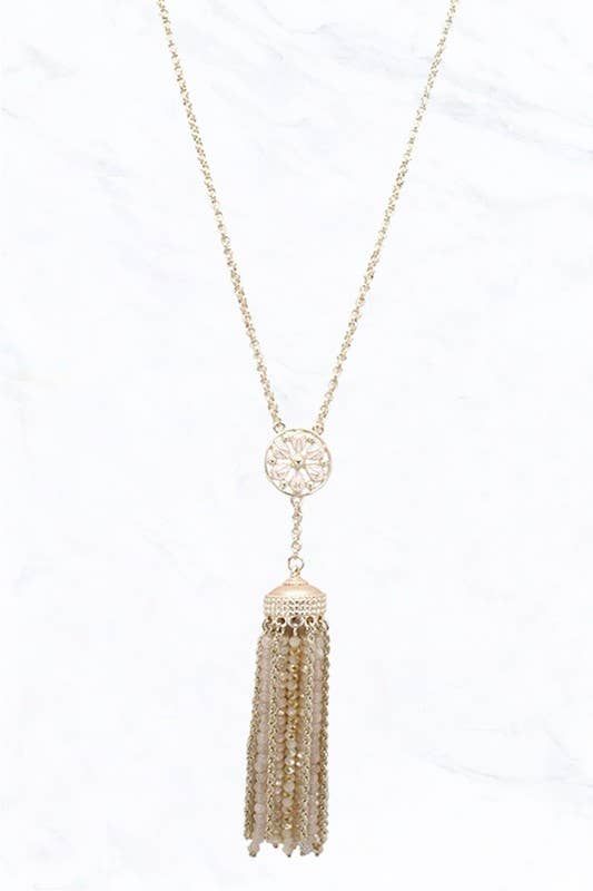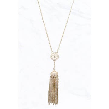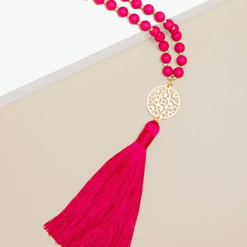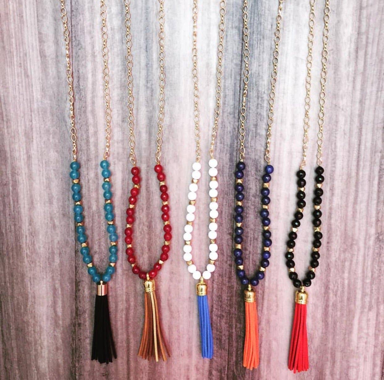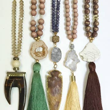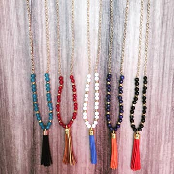 Glass beads and a silky soft tassel on heavy duty beading wire finished with a gold-plated lobster claw clasp. Beaded area measures approximately 33”. Tassels are 3-3.5”. Limited stock.