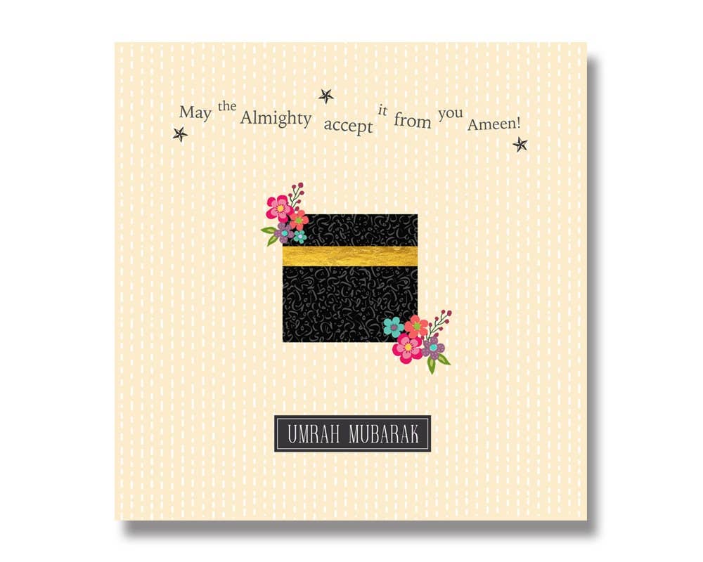 A contemporary Umrah Mubarak card from our multi-award-winning collection of Islamic greeting cards. The perfect way to congratulate family, friends, loved ones, or colleagues upon their return from Umrah. This Umrah Mubarak card measures 15x15 cm. It is supplied with a white envelope and packaged in a clear sleeve. The card is blank inside for you to write your heartfelt personal message and printed on premium quality FSC-approved board. Delivery: This greetings card will be dispatched via Royal Mail 1st class within the UK. International orders are shipped via Royal Mail International standard. Please note: The item offered for sale is a single card only.
