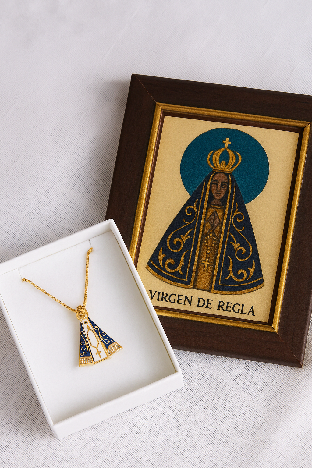Hermosos pendientes de madera con pintura de sagrado corazón y rosario.