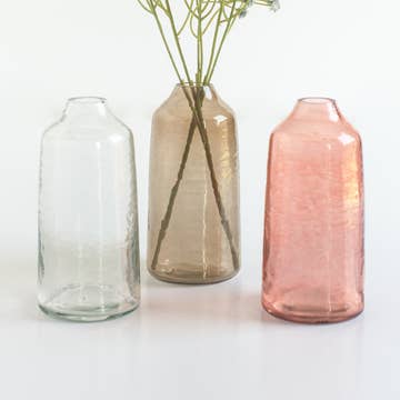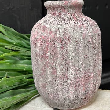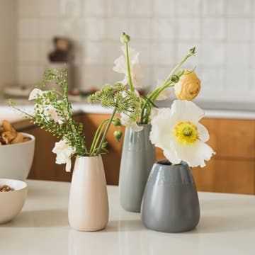 These natural vases are a fair trade product handmade in Kenya. They are hand carved out of stone and then sanded until smooth. The medium vase features an etched flower design. The large and the small vase are smooth. Since these vases show the natural colors of the stone, some color variations should be expected. One can often see shades of cream, gray, pink, and brown in the vases. Sold individually. In the picture with the white flowers, the medium vase is on the left, the large vase is in the middle, and the small vase is on the right.