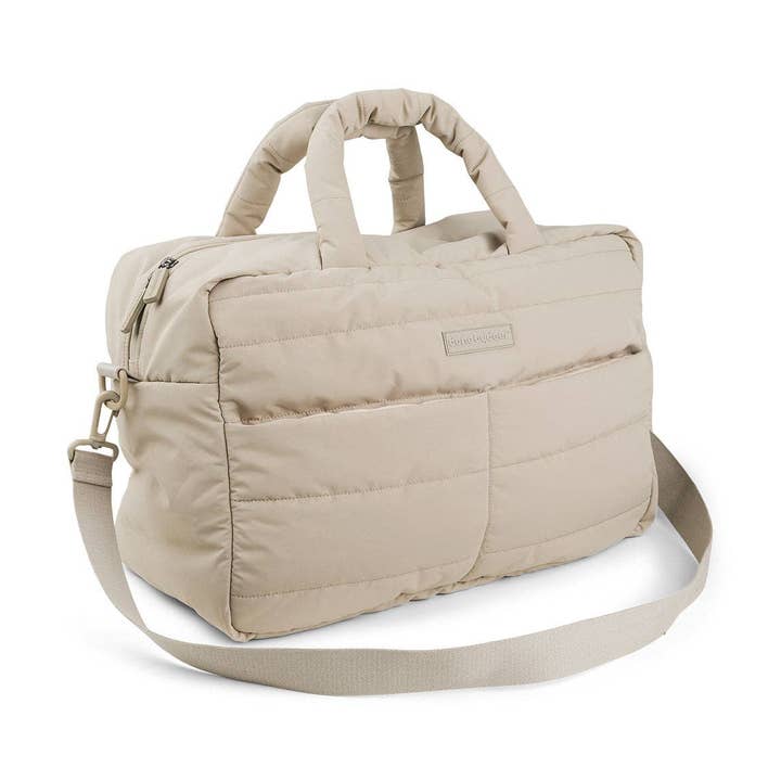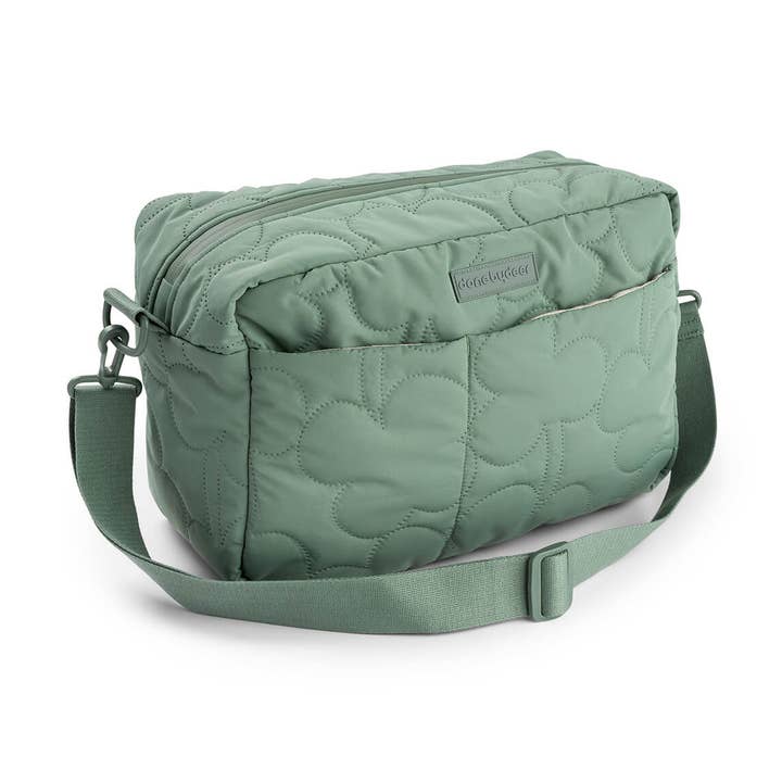 • Quilted changing bag for all your on-the-go baby essentials • Practical foldable changing mat and pram hooks are included • Durable and water-resistant surface • Top handles and an adjustable shoulder strap • One large compartment with four inner and three outer pockets • One inner insulated pocket that fits a bottle • Quilted bag in cool green shades with signature stripes on the pram hooks Material: 100% polyester (recycled). Care: Delicate wash at 30°C. Size: 41 x 21 x H 29 cm.