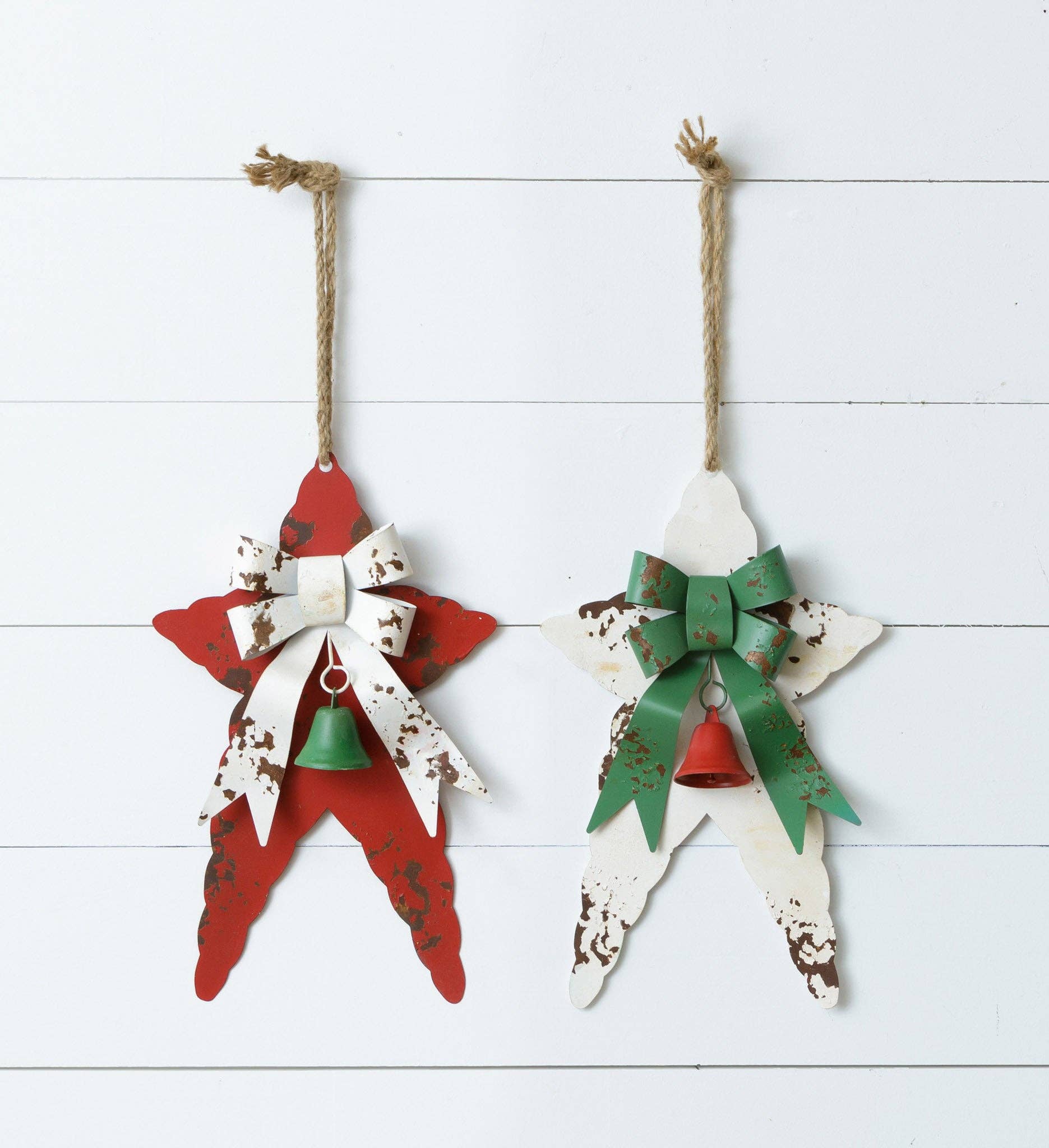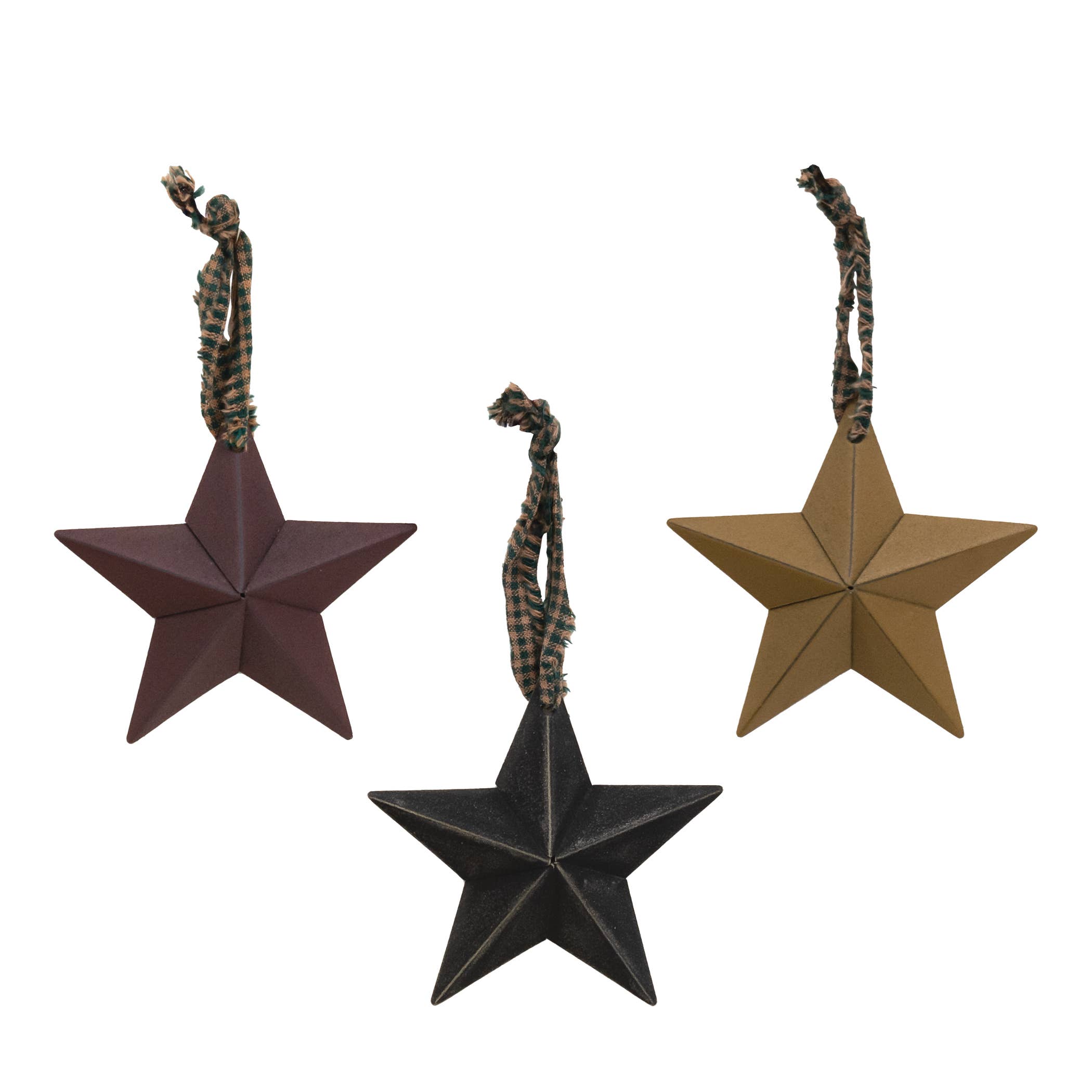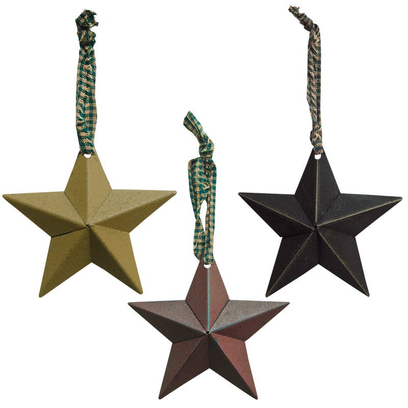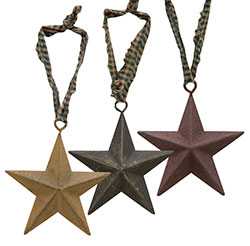 Primitive Cutout Star Ornament is made of painted, slightly distressed metal with small star cutouts and a homespun hanger. Ornaments comes in three assorted colors; burgundy, mustard, and black. The ornament measures 4" tall with a 3" hanger. Please note: This item features an assortment of designs which are priced individually, not as a set. When you order a quantity of 12, you will receive 4 of each design. Designs are not interchangeable.