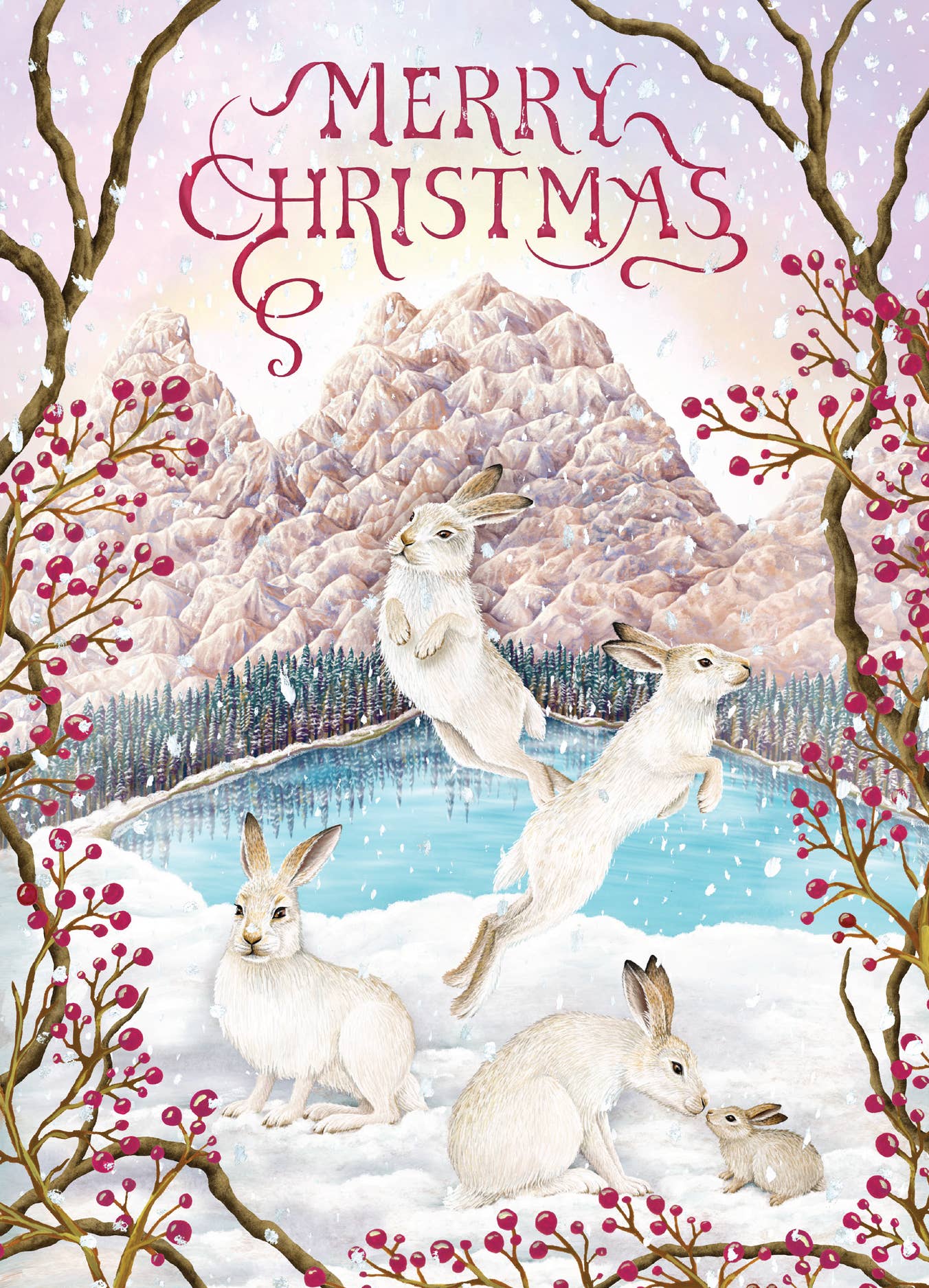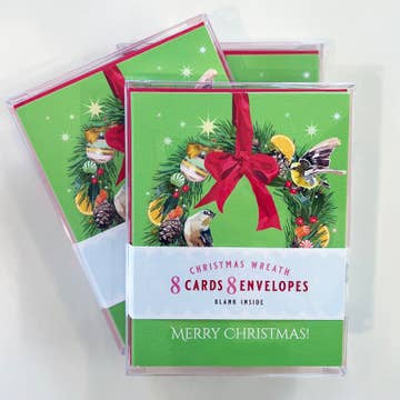 Includes 8 assorted greeting cards of the Christmas Crests Collection No. 2 Printed on 110 lb watercolor texture paper. A2 Size: 4.25" x 5.5". Blank inside. White envelope included. Cards come in clear card box for set of 8 with backer that shows all designs. INCLUDES Peppermint Bark It's the Most Wondillo Time of the Year Owl Be Home for Christmas Muletide Greetings Wishing You Hoppy Holidays Jingle all the Hay Deck the Halls with Cows of Holly Raccoon Around the Christmas Tree
