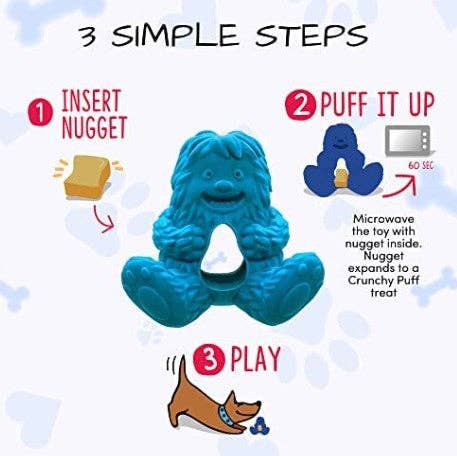 Yak Puff and Play Toy is a long lasting chew treat dispensing toy for light and light-moderate chewers. It comes in three different colors: Purple, Yellow and Orange. It is microwave and dishwasher safe and works well with all natural Yeti Nuggets. ***These toys are not designed for heavy aggressive chewers.*** Directions: • Insert 1 piece of nugget inside the cavity. • Microwave the toy with nugget inside for 60 seconds. The nugget will puff up to twice its size and fill the entirety of the cavity. • Let it cool and let your dog enjoy the crunchy treat! Refill nuggets can also be purchased separately. Do Not give the nugget to your dog directly without puffing it first.