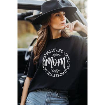 Made in United States Aesthetic: Casual and Classic Care Instructions: Machine wash Color: Black Fabric: 50% polyester, 25% cotton, 25% rayon Fit: Contemporary and Missy Neckline: Crew neck Occasion Theme: Baby Shower, Everyday, and Mother's Day Occasion: Everyday and Loungewear Season: Core Sleeve Length: Short Sleeve Theme: Family & Friendship