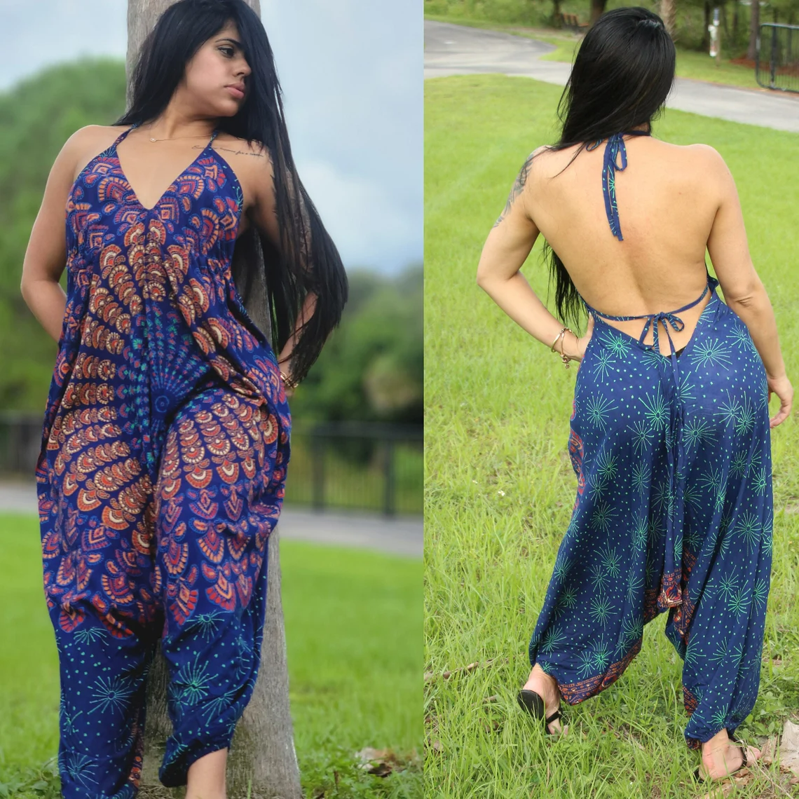 This Bohemian romper is possibly the most comfortable piece of clothing you will ever wear. Made from first quality breathable super soft rayon fabric, this jumpsuit is perfect for the beach,resort or just lounging around. Sizing: * Made in one size fits Small to LARGE Care Instruction: * Hand wash/ Delicate cycle in cold water and hang to dry. Low heat iron/steamer ok.