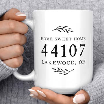 This custom city/zipcode coffee mug Is one of our best sellers with a high sell-through rate. Love where you're from with this City & Zip Code Luxe mug -specific to your hometown. This mug comes ready to gift! Here are all the details: ☁️ Oversized 15-ounce size ☁️ Microwave safe; dishwasher safe ☁️ Ceramic, White and glossy ☁️ Mug artwork is dye-sublimated The print becomes a part of the mug! ☁️ Send Me a Dream Mugs are Made to Order, please allow time for design and printing Please note-as white-labeling is against Faire policy, and as we're a super small business that works really hard to make our brand recognizable, our logo appears on all mugs-small, on the back in a .65in circle. (We do not have the capability of printing on the bottom of the mug). We work so hard and are proud to be a brand featured in your shop!
