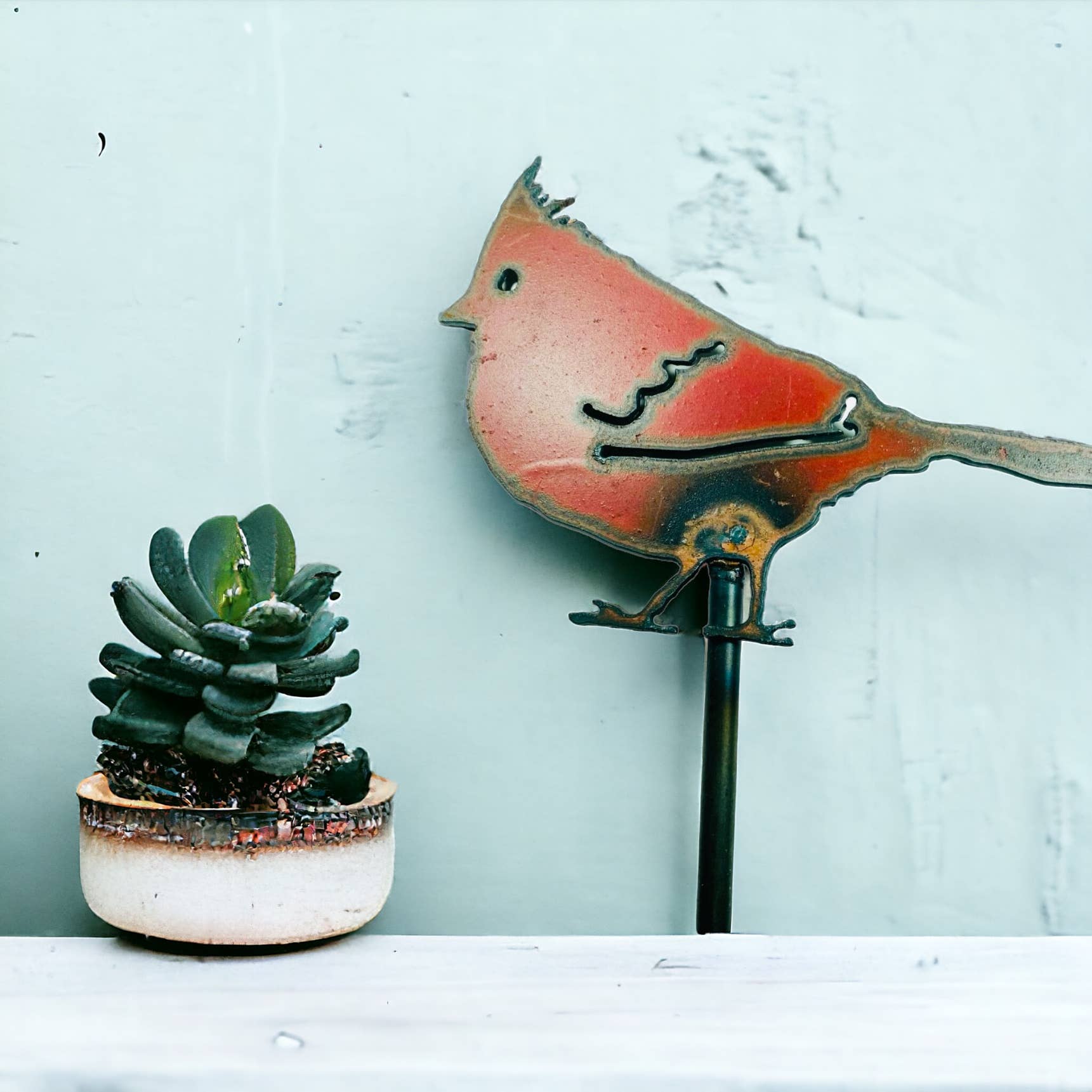 16" plant stake with Cute Bird painted in turquoise and clear sealed. Painted on one side and clear sealed rust on other side. Made in the USA. We use recycled metals. As any expert gardener knows, growing a full flower bed is part art, part science. Bulk up on the former by enchanting with our garden stakes. Made of laser-cut steel and designed to patina naturally outdoors, these hand-welded pieces add homegrown charm to your bed of botanical babies. Place them at the edge of your garden to create an organic-feeling border, or embed them in your blooms as an eye-catching ornament. Handmade in Texas.