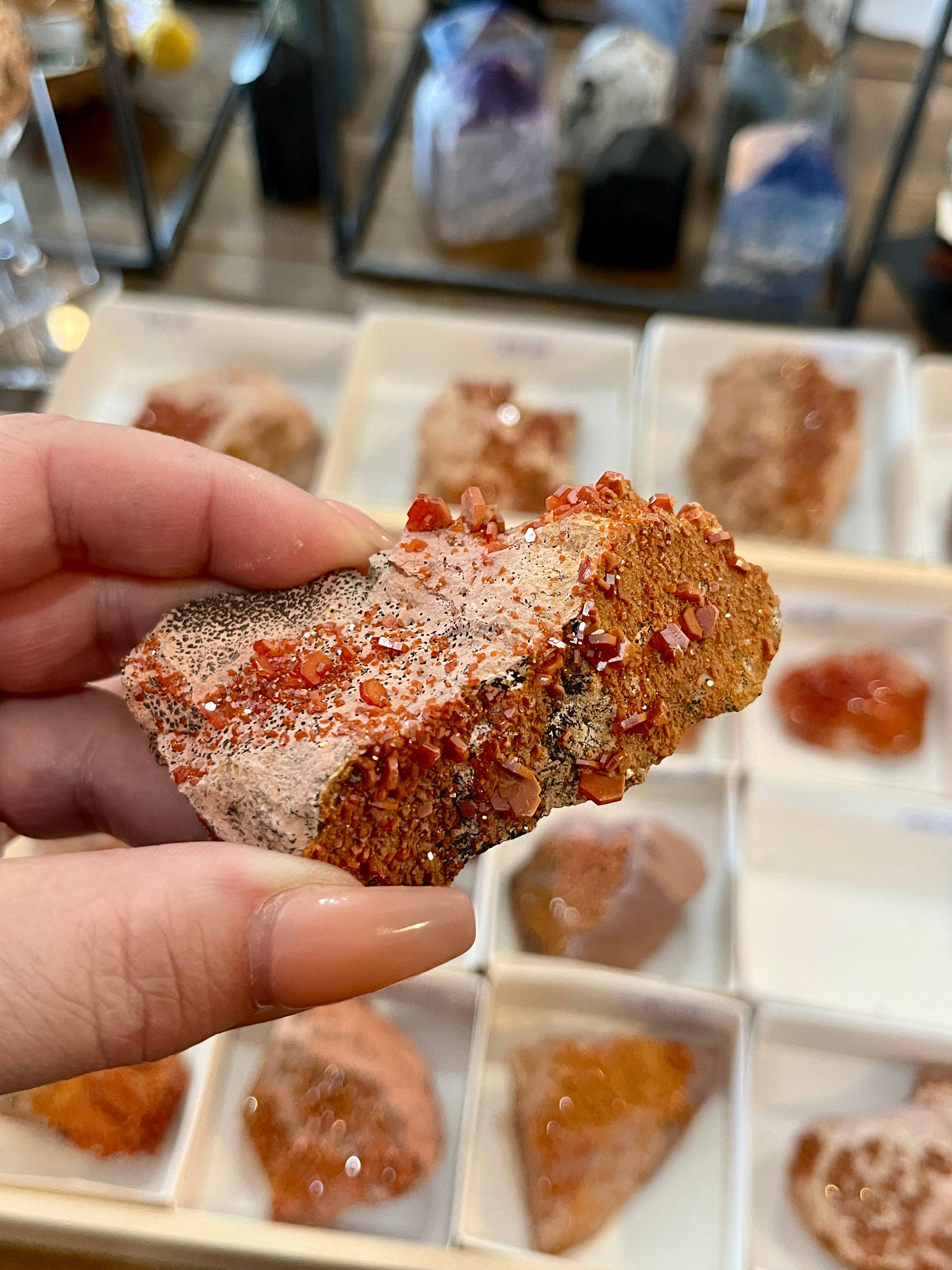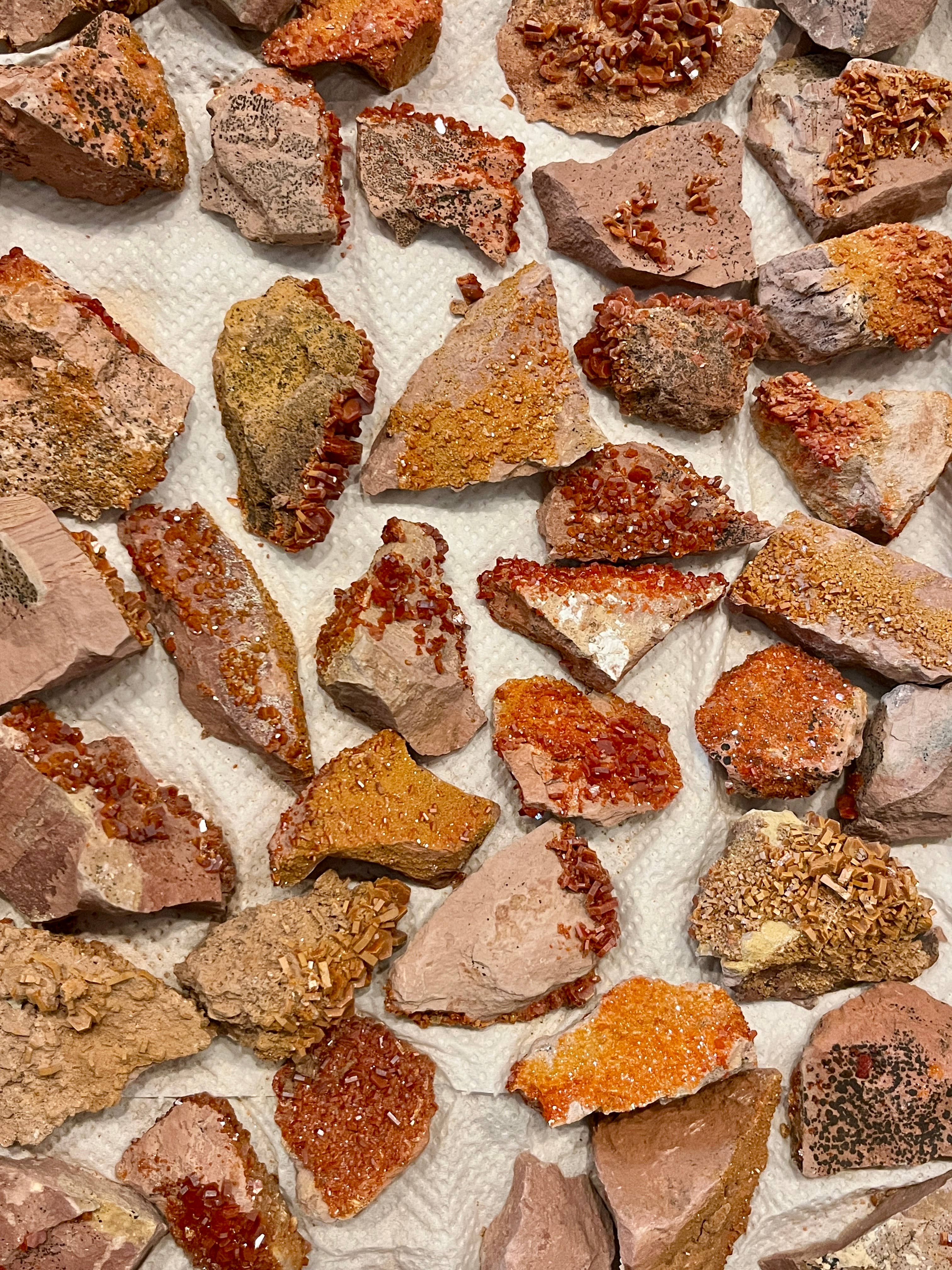 Vanadinite on Matrix from Mibladen, Morocco Vanadinite is considered a powerful grounding stone that can enhance focus, concentration, willpower, and manifestationabilities. it is often associated with increased energy flow within the boxy, aiding in decision making and achieving goals, particularly when dealing with issues related to personal power and vitality. You will recieve a full flat, box with approximately 65 pieces