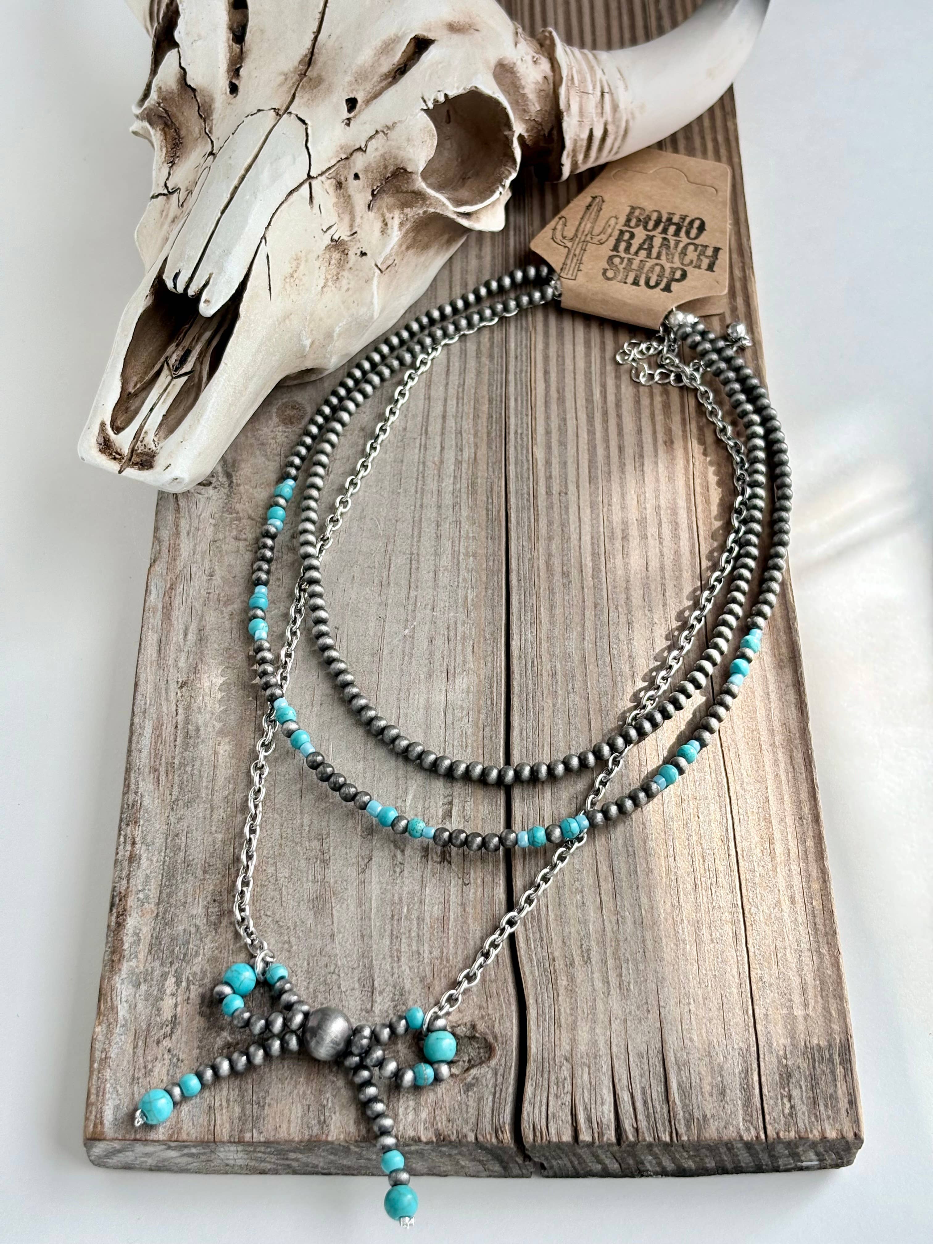 Multi-strand necklace with adjustable lobster claw closure and 2" extension. Each strand is a beaded chain link. The longer strand has a soldered rectangle stone pendant. Length: 18.5" Short Strand: 16" Pendant: 1.5"