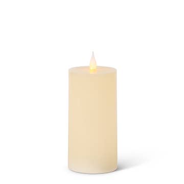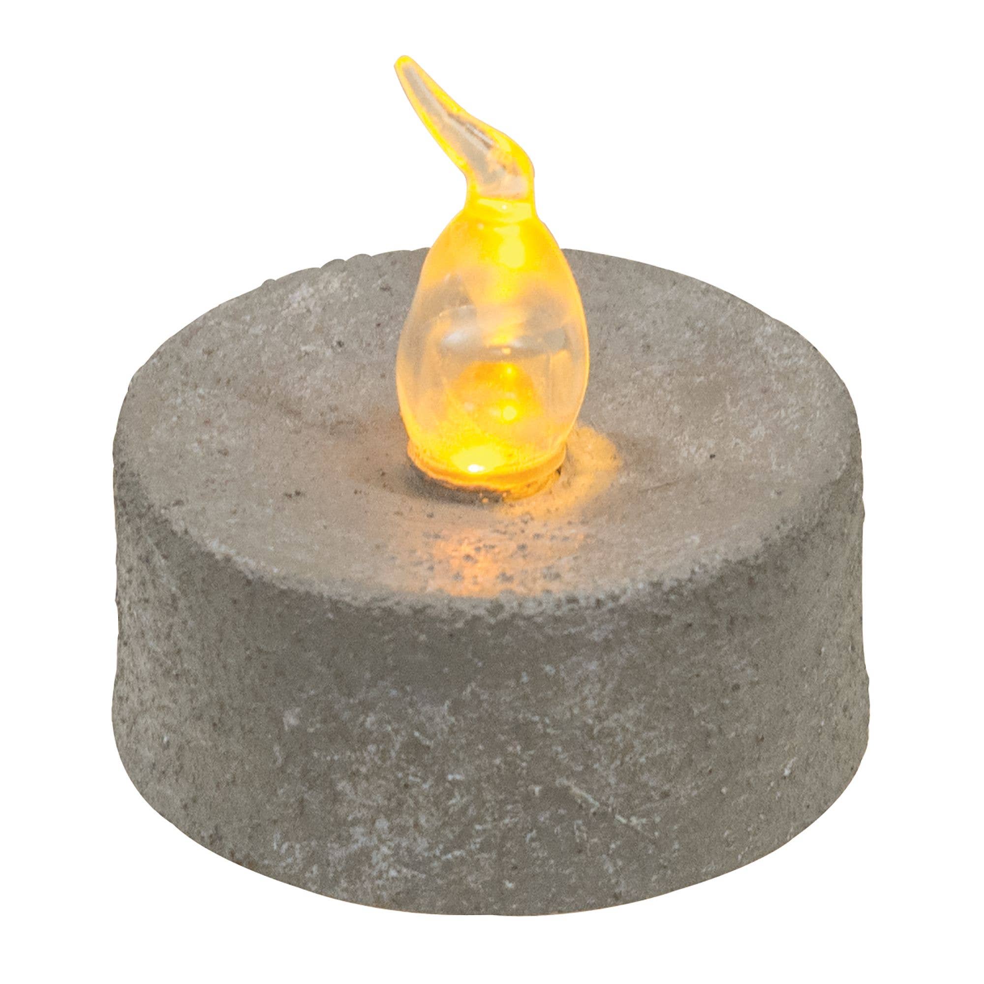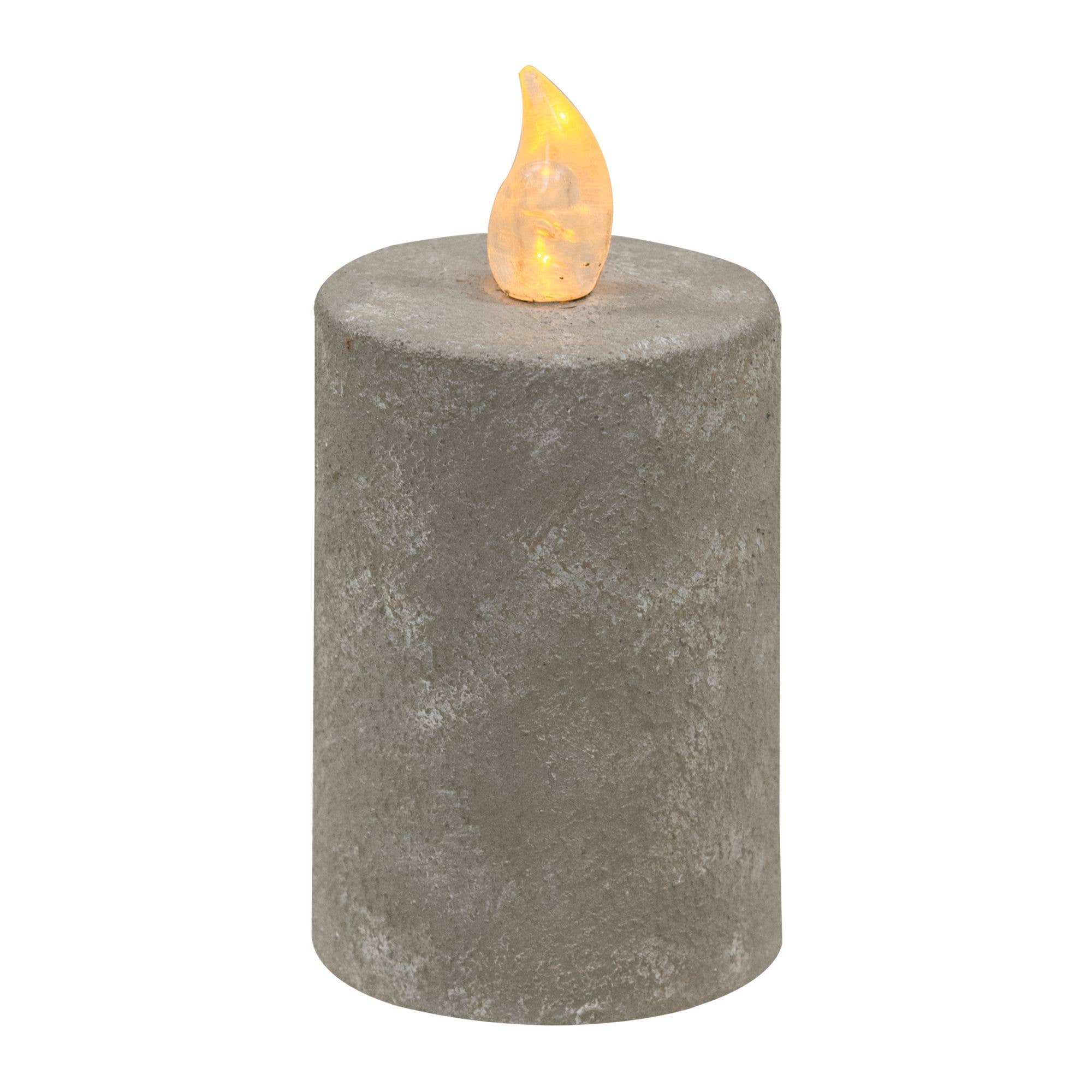 Cement Look Pillar is a battery-operated candle that perfectly blends the modern and traditional farmhouse decor styles. The candle features a cement like texture and has on/off and a built-in timer function that can be set to turn on for 6 hours and off for 18 hours. The flame-shaped bulb is coated in silicone, glows a warm yellow color and features a flickering effect. It is powered by 2 AA batteries (not included). It measures 3.5 inches tall and is 2 1/4 inches in diameter. Color: Gray.