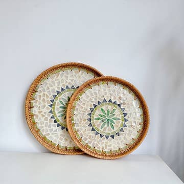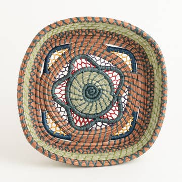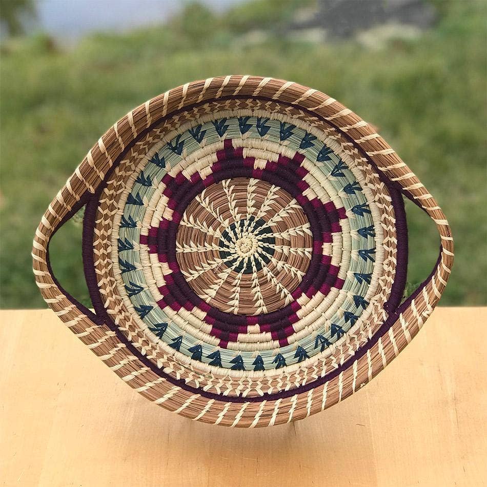 The Estrella Basket is a smaller version of the popular Dahlia Basket. It is intricately woven of pajon, a native wild grass, and pine needles with colorful raffia accents. Handmade and designed by the women of Mayan Hands, this sturdy basket may be decorative, but it's entirely functional too. Approximately 7"W x 1.5"H