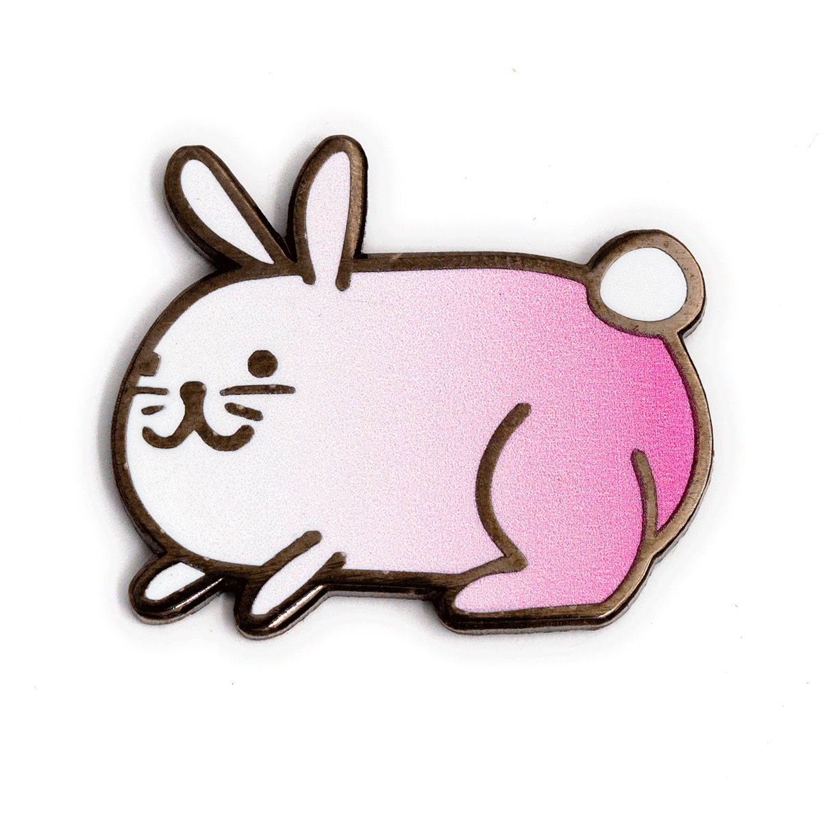Hard enamel, 1.5” height, rose gold plated, print. Only a monster wouldn’t love a cuddly bunny. Don't be a monster. This hard enamel pin is rose-gold plated, and features silkscreened details. It comes with two minty-green rubber clutches, and a coordinating backer card. Attach this little bun to your favorite piece of clothing/accessory, or display it like a snuggly little work of art. Measures 1.5” from ear tips to bum.