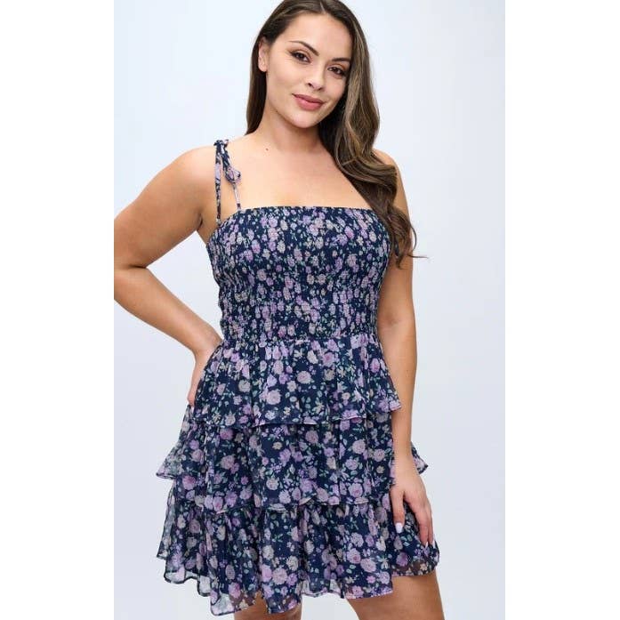 Spaghetti strap ruffle hem floral lace mini dress Spaghetti strap V neckline Padded for bust support Princess seam detail Double faced front top Fully lined Crossover front skirt Asymmetric tiered ruffled hem Back zip closure Medium stretch for comfort CONTENT & CARE: Floral lace fabric 90% nylon, 10% spandex hand wash cold water separately color will bleed no bleach hang to dry imported *Model is 5'7" and wearing a size S
