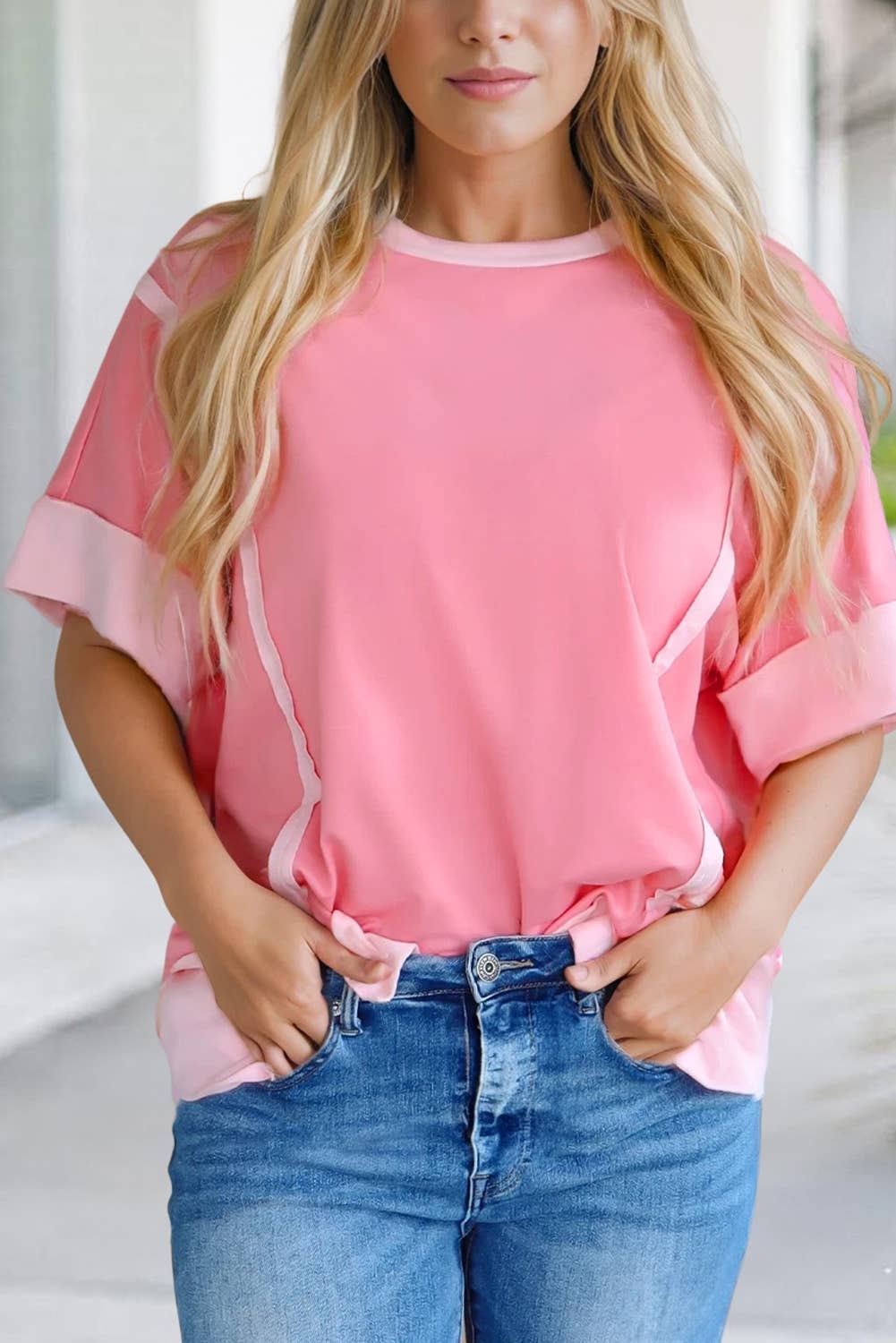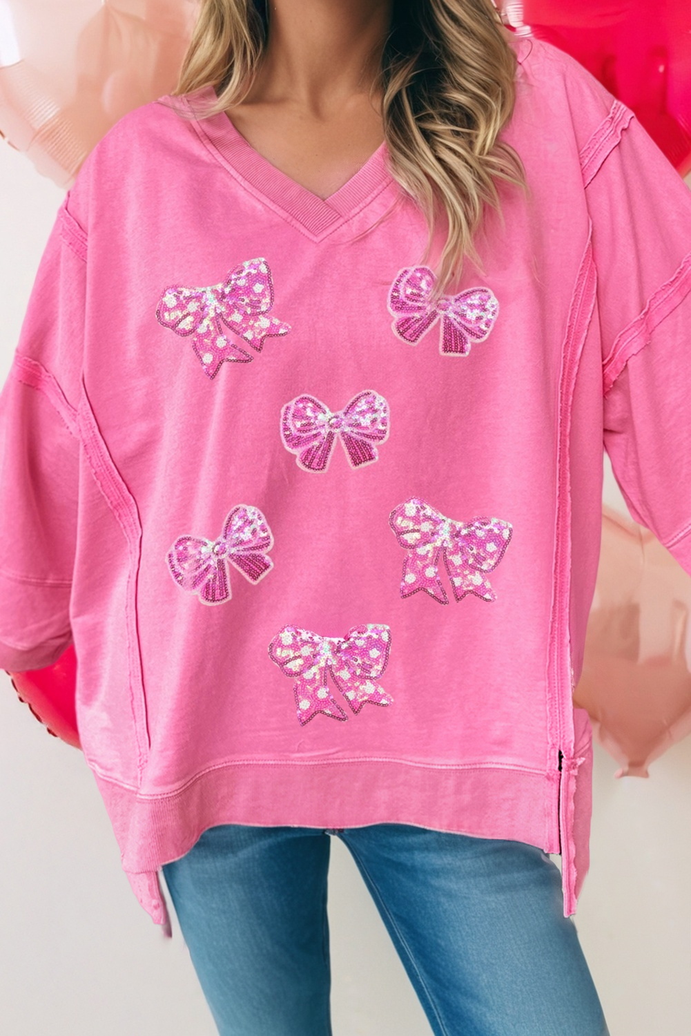 🌺Material: 95%Cotton+5%Elastane 🌺Pattern: Solid,striped,Heart-shaped 🌺Neckline: Round Neck 🌺Sleeve: Long Sleeve 🌺Details: Colorblock,Decoration 📏Size Chart(INCH) | Size | Bust | Hem Width | Sleeve Length | Length | |-------|-Relax-|-----Relax-----|-------Relax-------|--Relax--| | S | 39.4 | 42.5 | 28.5 | 24.7 | | M | 41.7 | 44.9 | 29.0 | 25.5 | | L | 44.1 | 47.2 | 29.6 | 26.2 | | XL | 47.2 | 50.4 | 30.3 | 27.0 | This pink pullover top delivers a cute, casual look for the Valentine's season. Patchwork detail adds trendy contrast with visual interest. Long sleeve loose top offers relaxed comfort for all-day styling. Effortless to pair with jeans or leggings for a chic look.