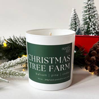 Our Version of Frasier Fir - meet Christmas Tree Farm! Transform your space into a holiday wonderland with our Christmas Tree Farm candle. Infused with the invigorating aroma of freshly cut pine, it evokes the warmth and magic of the holiday season. Our candles are made with all natural coconut soy wax and a crackling wood wick. We use premium fragrance oil that is phthalate-free, paraben-free, non-toxic, and gluten-free. Each candle is hand poured into a 9oz amber jar topped with a gold lid. Approximately 40-50 hours of burn time. Size: 9oz Jar Height: 3.5” Jar Diameter: 2.7”
