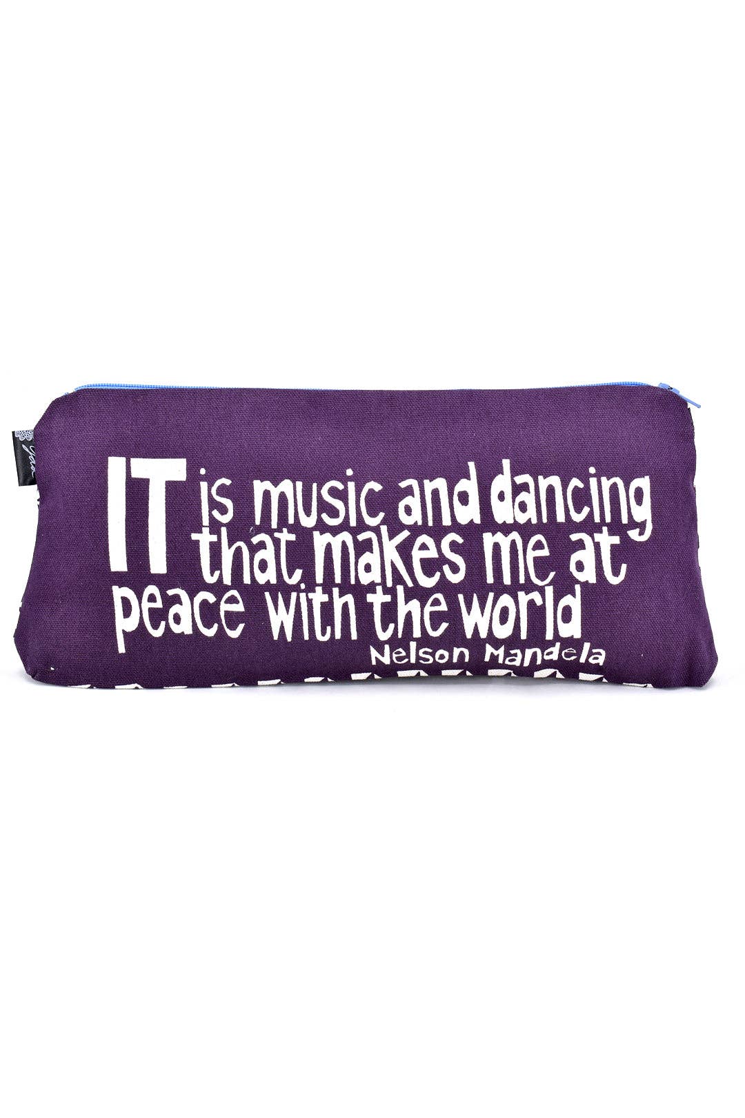 At Yda Walt Studios in Johannesburg, South Africa, talented owner/designer Yda Walt and a small team of artisans dream up inspirational products centered on South African life and ethos. Beautifully screen printed, lined and finished with a contrasting zipper and gusseted bottom, this statement pouch showcases Nelson Mandela's quotation, "A winner is a dreamer who never gives up." The complementary screen-printed pattern at the bottom of the pouch wraps the entire back side. Sold singly. Because this is a handcrafted item, each will vary slightly. Dimensions: 12.5"L x 1.25"W x 5.5"H Crafted from: Cloth, zipper Made in: South Africa
