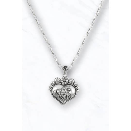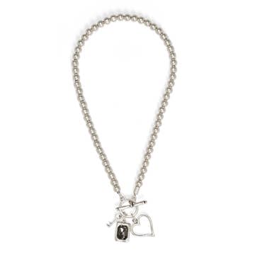 This decorative necklace comes on a stainless steel chain and 18 inches. Each necklace includes a crystal accent bead in white and an accent heart. Our charms are 100% hand made with American pewter.
