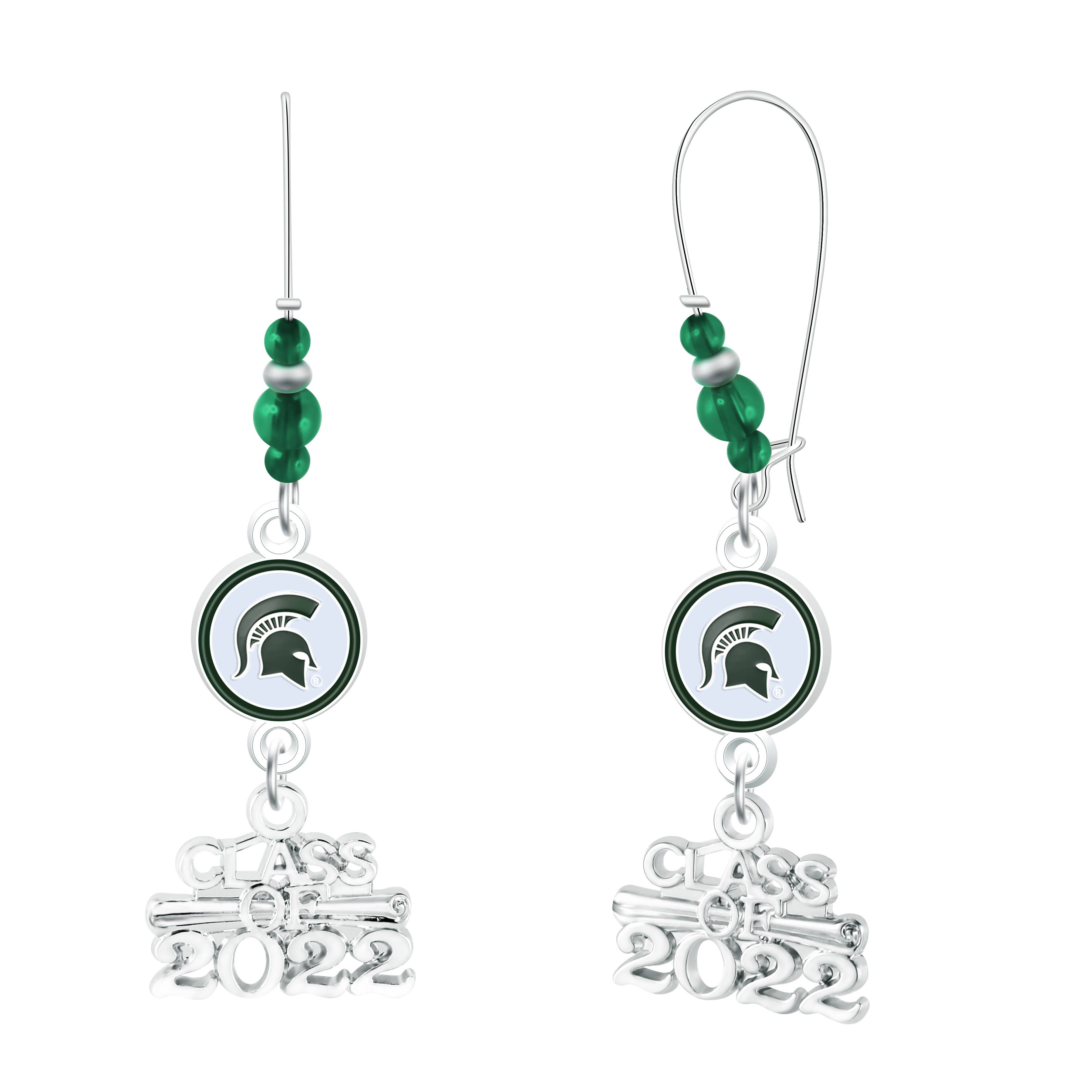 Silver plated post earrings with green rhinestone Michigan State Spartans logo charms. This is an officially licensed product.