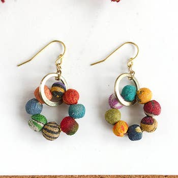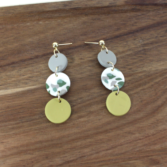 Reversible silver and resin earrings with two stacked dots. This pair features Grass Green/Purple on one side, Orange and Tomato Red on the other side. Wear them matching or mismatched! The charm is approximately 3/4” long.