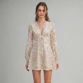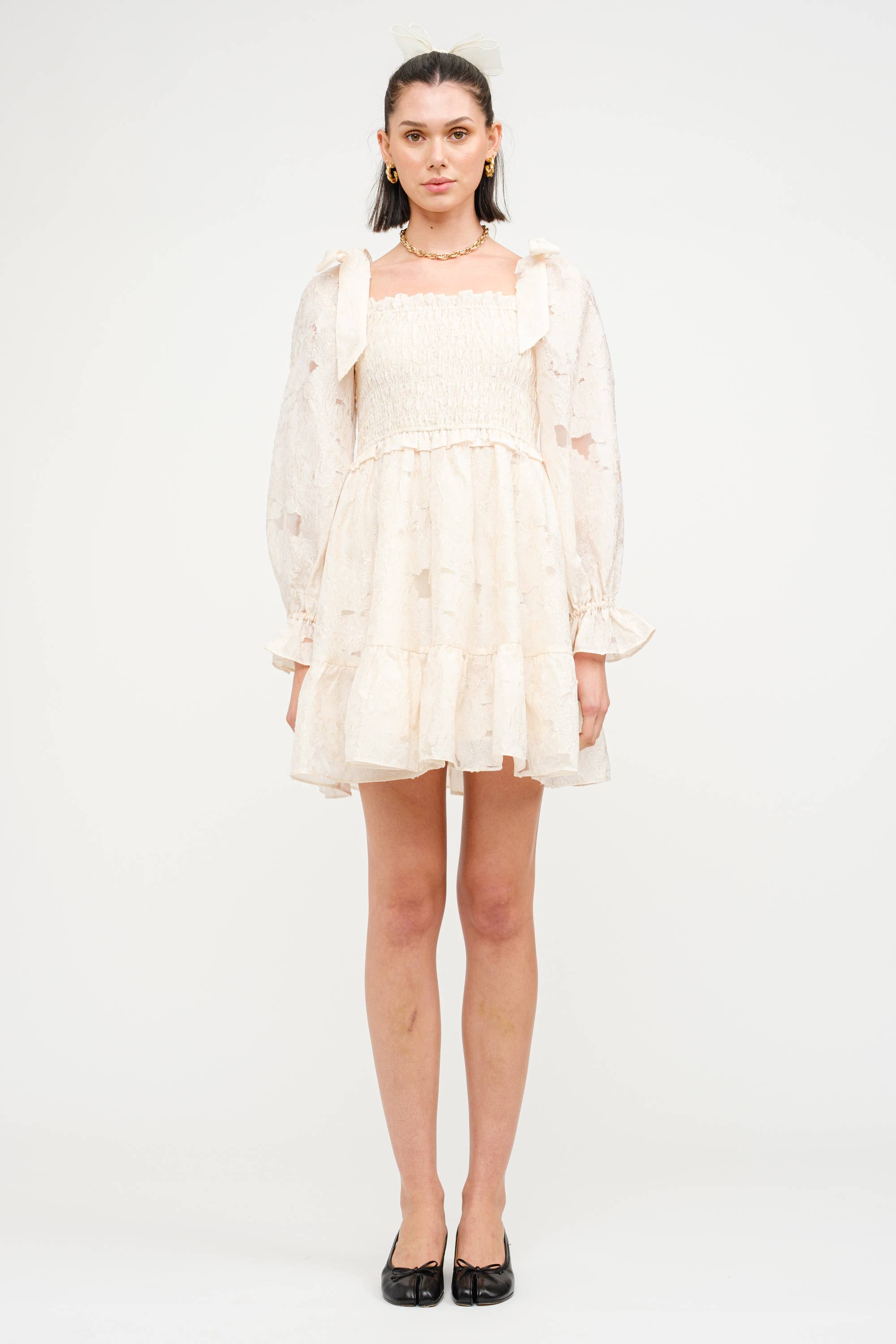 Lana Ivory Dress: A fairytale in ivory-this jacquard mini dress is brimming with soft femininity and timeless charm. Designed with voluminous puff sleeves and a flowy A-line silhouette, it's effortlessly flattering while evoking a romantic, vintage-inspired allure. - Square neckline with romantic ruffle trim - Voluminous puff sleeves for a dreamy silhouette - Tonal rose jacquard design with subtle texture - Relaxed A-line shape for effortless wearability - Mini length with airy, romantic flow Care Instructions: - Hand wash cold - Do not bleach - Line dry - Iron low if needed - Do not tumble dry Fabric Content: Self: 50% Polyester, 50% Cotton Lining: 100% Cotton Model is 5'11" and is wearing a size small