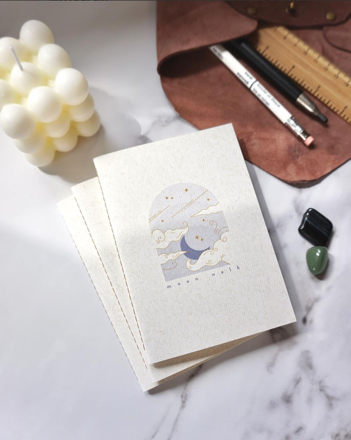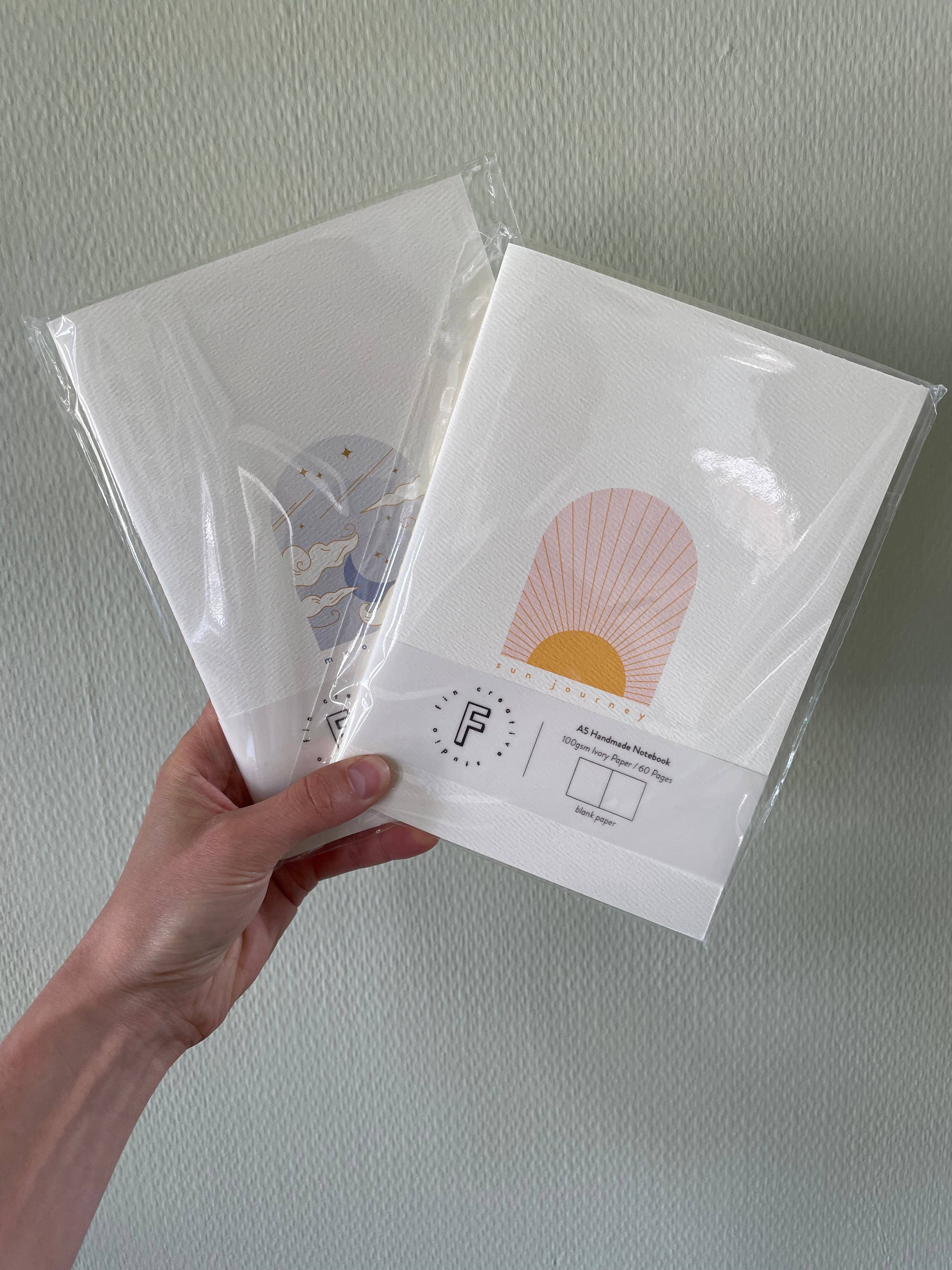 Moon Walk - Single Sewn Handmade Notebook, designed by Fin Studio! This notebook and the Sun Journey were designed as a set I recommend taking a look. Inspired by meditation and yoga, each piece is meant to resonate with your soul and body. Choose the one that speaks to you and keep it with you as your meditation journal. About Fin Studio notebooks; From printing the covers as the first step to cutting the edges as the last, we craft each notebook individually. We sew them one by one, fold them carefully, and use a wooden book press. Behind every notebook are countless trials, experiments, and moments of pure joy! Features; - Available in 2 sizes, + A6 (travel size 10x14 cm) + A5 (14.8x21 cm) - 60 pages - Inner pages FSC certified 100gsm acid free paper & colour is ivory - Cover 270gsm G.F. Smith paper - Single sewn / Dark orange thread - Comes with Biodegradable Cello Bag* Thank you!