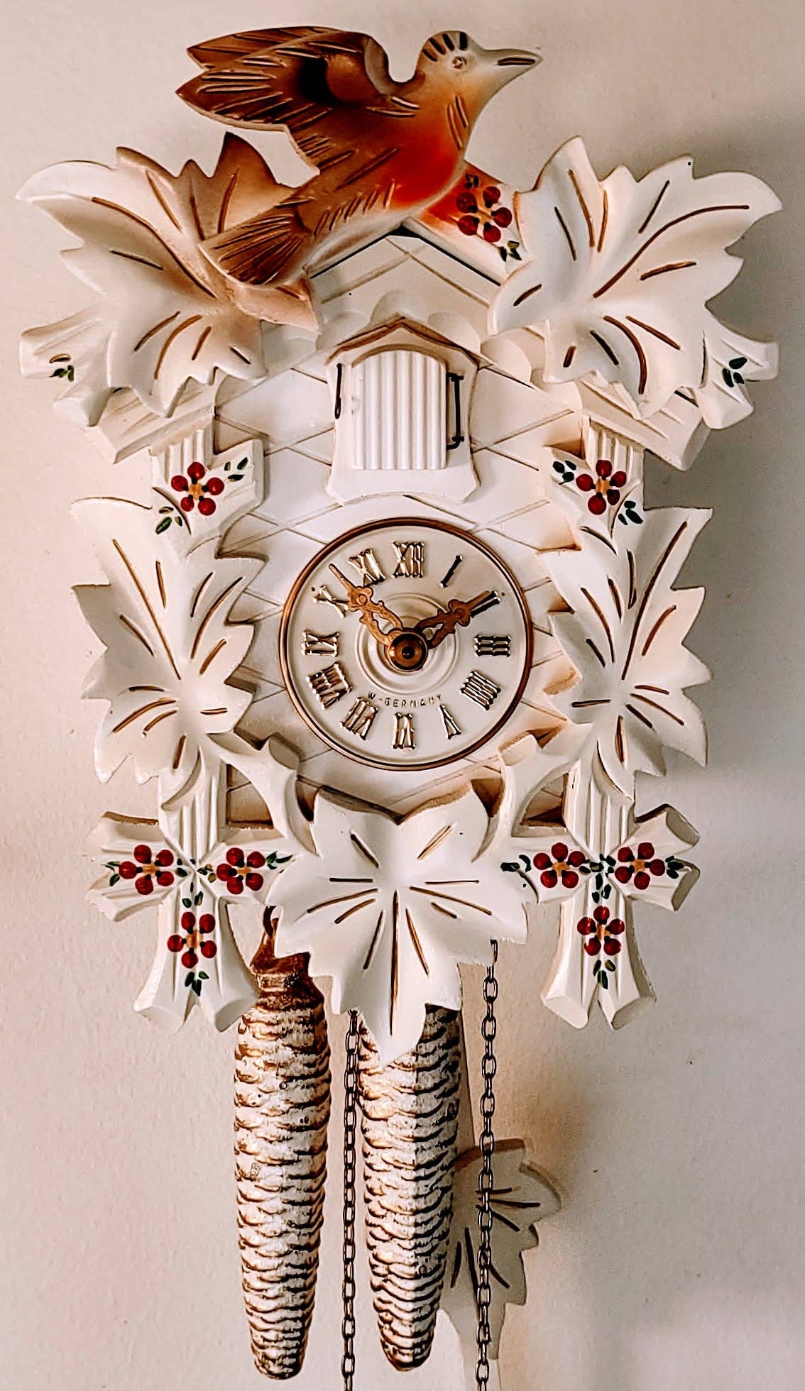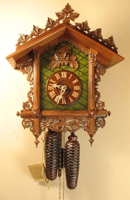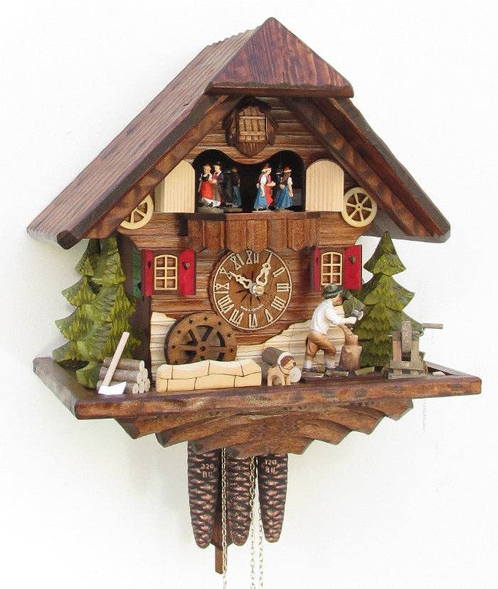 9″ x 9″ x 7″ This is a charming piece from Rombach und Haas. It features an animated chimneysweep and is an affordable clock with all the charm of a Black Forest cottage. The clock has wooden hands, a bird, and a wooden dial. It has fine woodcut features and incredible wood carvings with exquisite detail. The clock is made and packaged BY HAND by Black Forest craftsmen the same way they have been for hundreds of years. The sound of the bird is produced by real wooden whistles. 2-year warranty Made in Germany Wooden hands, numbers, and bird Shut-off switch for cuckoo call Animated chimneysweep Hand-laid shingles Traditional Black Forest chalet, pine tree, deer, windows Official Black Forest clock, certified by the VDS A Romba original!