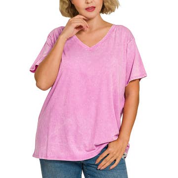 ***Image usage is allowed to the buyers who purchase from us via Faire only. SI-25676 PLUS SIZE FRENCH TERRY ACID WASH RAW EDGE RAGLAN SHORT C - RAGLAN CUFFED SHORT SLEEVE - ROUND HEM - DOUBLE BACK SEAM - BACK PATCH ** Each item is unique, expect variations in color and finishing TOTAL BODY LENGTH: 29", BUST: 52" approx. - MEASURED FROM 1X Fabric Content: 100% COTTON Plus Size Clothing Zenana Label BrandBestseller