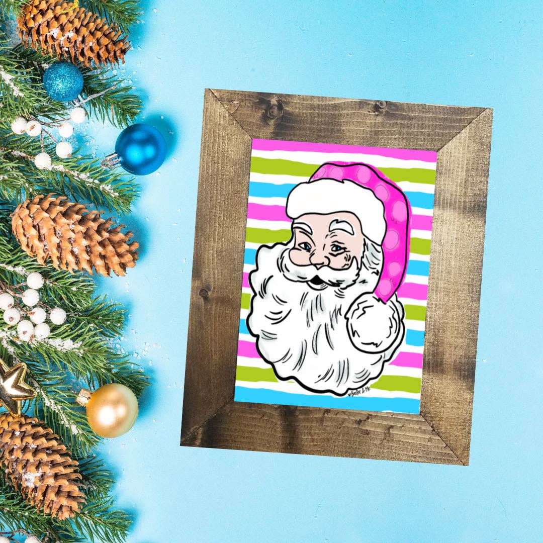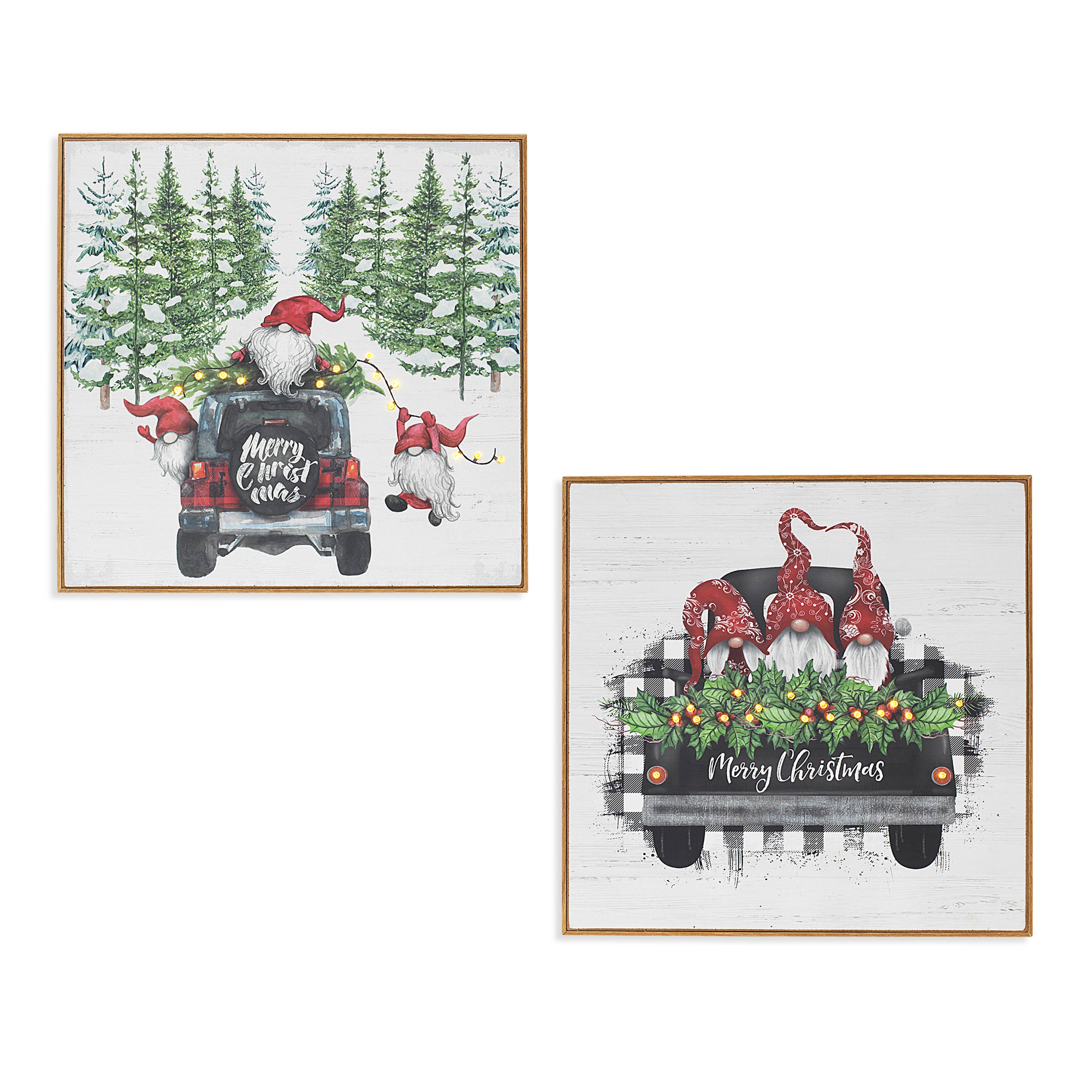 This art print features three festively dressed gnomes with bushy white beards, all wearing Santa hats, riding in the back of a vintage truck with a wooden tailgate. Large holiday lights dangle from the tailgate, and a beautifully decorated Christmas tree rests behind the gnomes, adding to the festive cheer. Perfect for hanging in your living room. • Printed with vivid colored inks on cotton canvas mounted on wood • Solid hardwood frame in shown stain colors • Sustainable American sourced wood • Made in the USA in our Utah studio • MINI 6" tall x 6" wide x 1.25" deep w/ 1/4" thick frame • SMALL 11" tall x 11" wide x 1.25" deep w/ 1/4" thick frame • MEDIUM 15" tall x 15" tall x 1.5" deep w/ 3/4" thick frame • LARGE 22" tall x 22" tall x 1.5" deep w/ 3/4" thick frame • Signs may have +/-1" variations • All signs can stand on a shelf or table (Medium & Large can also hang on a wall) • Farmhouse style frames have small rustic imperfections that make them unique