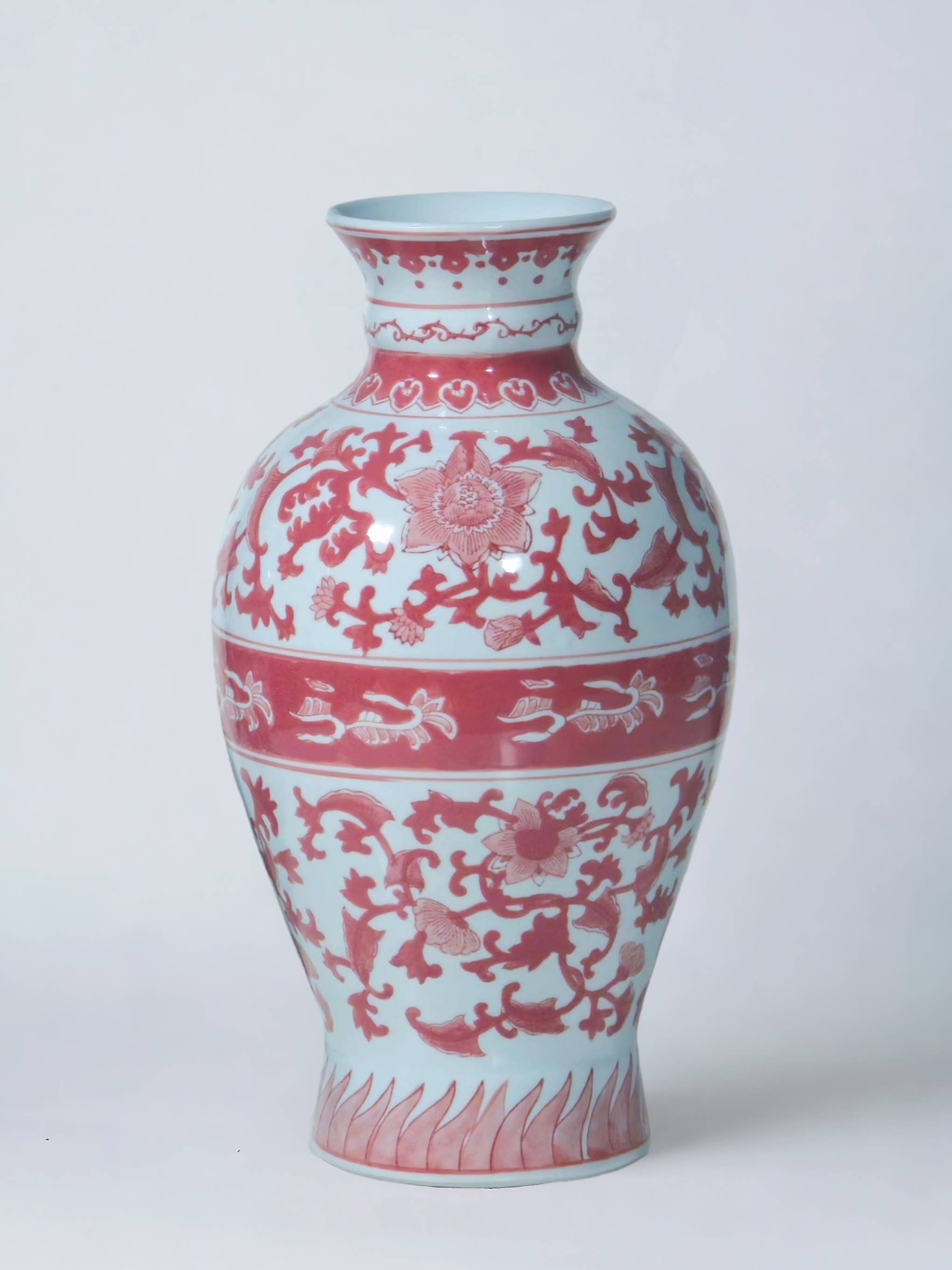 This classically shaped 9" porcelain ginger jar will bring a touch of class to any room. Perfect by itself, in pairs or displayed with other porcelain pieces as a collection. Chinoiserie red deer and floral design.