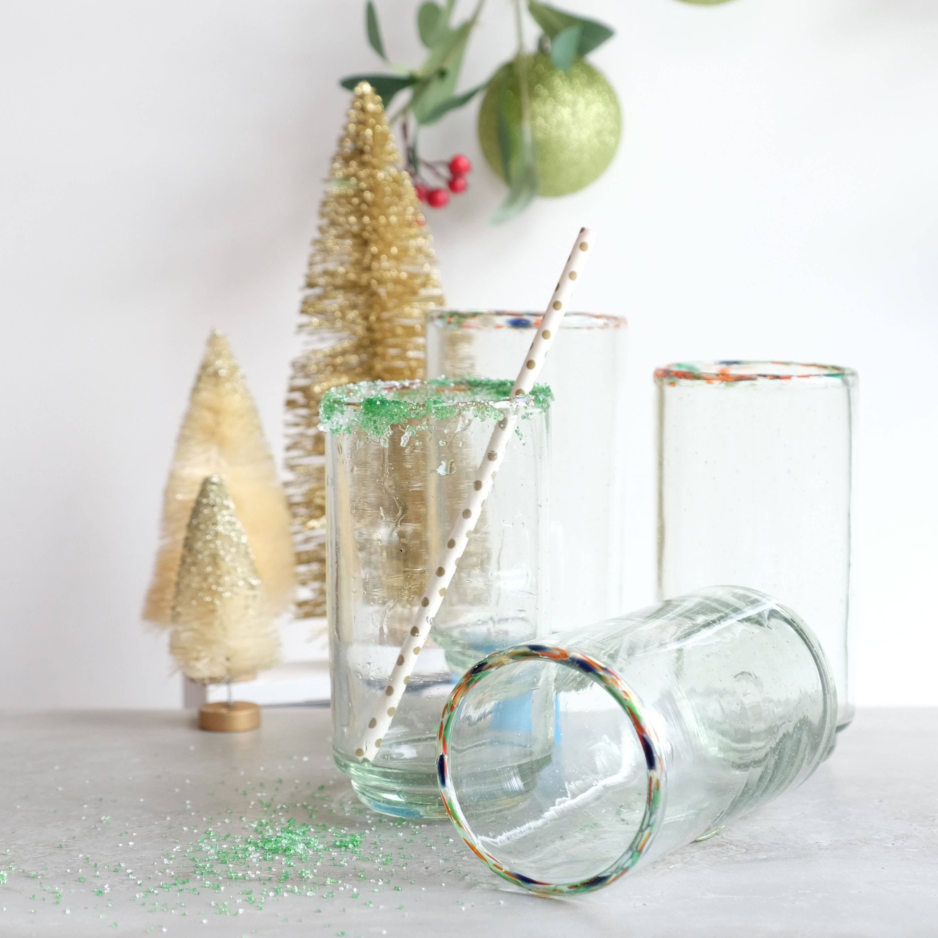 About the Product Elevate your glassware collection with our handblown Stacking Glass — perfect for everything from morning juice to evening cocktails and water. Made from recycled glass, its clean shape and subtle rim detail bring everyday sophistication to the table. Great for all gatherings, including both indoor and outdoor entertaining. Our stacking glasses are: *Size 2.5" D x 6" H, hold 16 oz *Handblown from 100% recycled glass *Dishwasher safe for easy cleanup *Designed to stack for space-saving storage *Available in Aqua, Blue, Green, Amber, White and Multicolored rims *Handmade by artisans in Guatemala Inspired by traditional Mexican glassware, each piece is blown and shaped by hand, giving it a unique charm. The artisan collective behind these glasses supports their local community through fair wages, insurance, and environmental renewal. Perfect for: Holiday entertaining, housewarming gifts, sustainable barware, or everyday drinkware with a handcrafted touch.