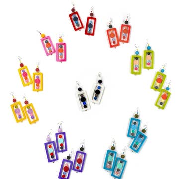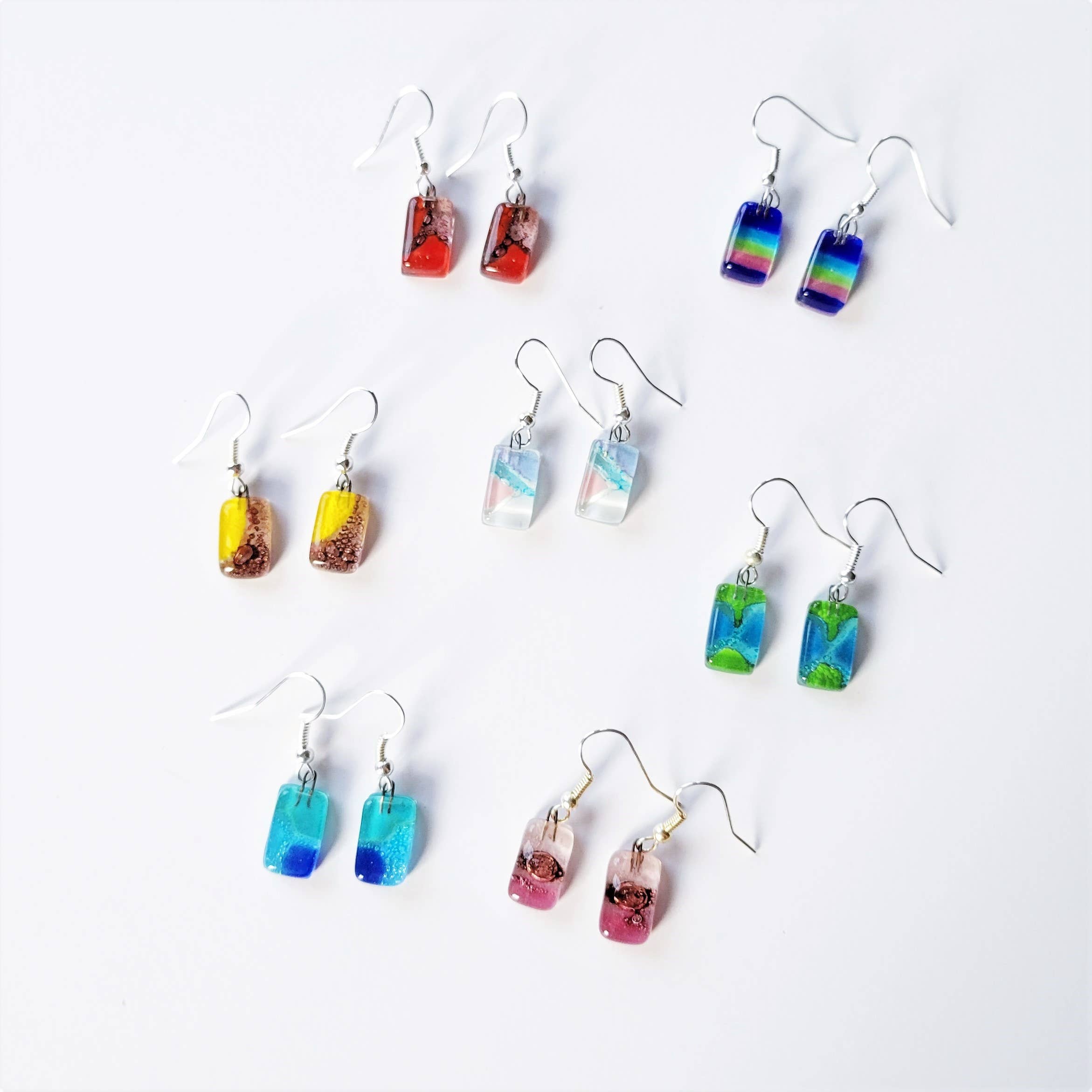 These fun earrings are made to match our frosted glass dot collections or are simply great on their own. Spaced with faceted black crystals for a touch of depth and sparkle. A perfect compliment to many modern art collections. This item will come assorted unless otherwise specified. Frosted glass, like beach glass, whitens with time and wear. Rub with a little baby oil to brighten the color. Dimension: 0.75 inch.