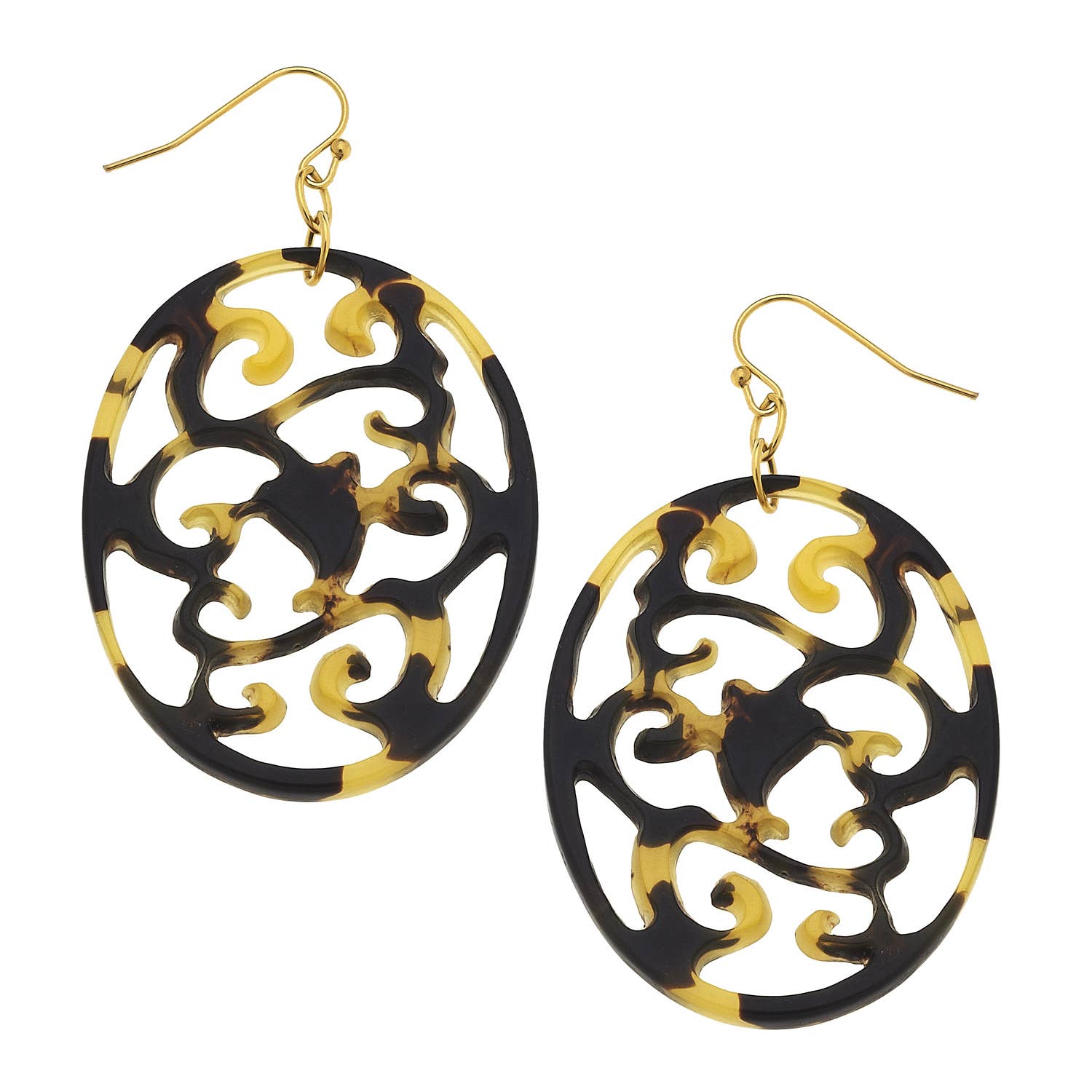 Lightweight, premium-grade resin drop earring in the circular, Traveling Pendant cutout design. Post back closure. 1.5" drop. Nickel and lead compliant (hypoallergenic). One size.
