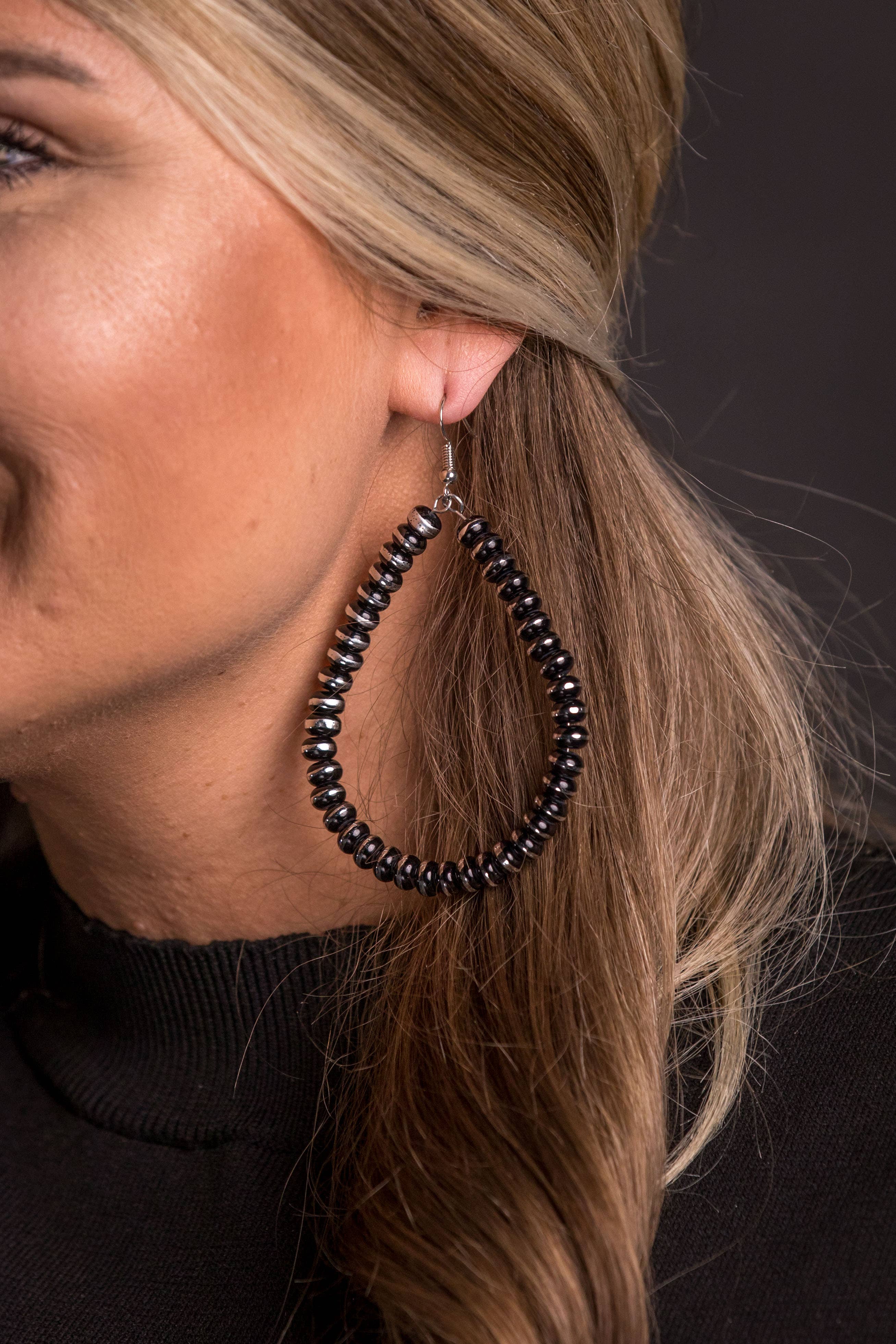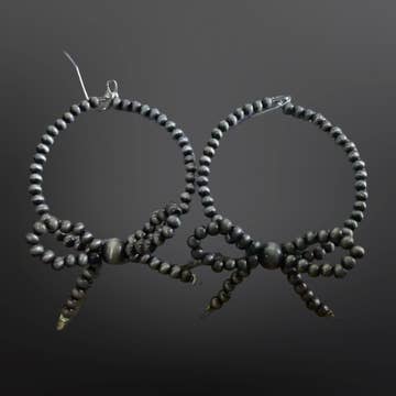 Earrings, gunmetal glass seed beads, sterling silver, about 2.75 inches long.
