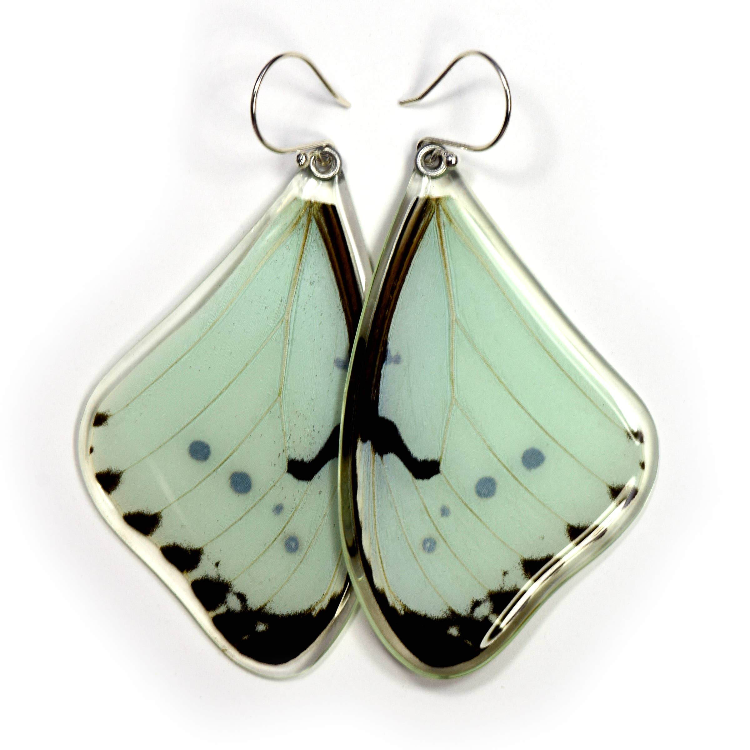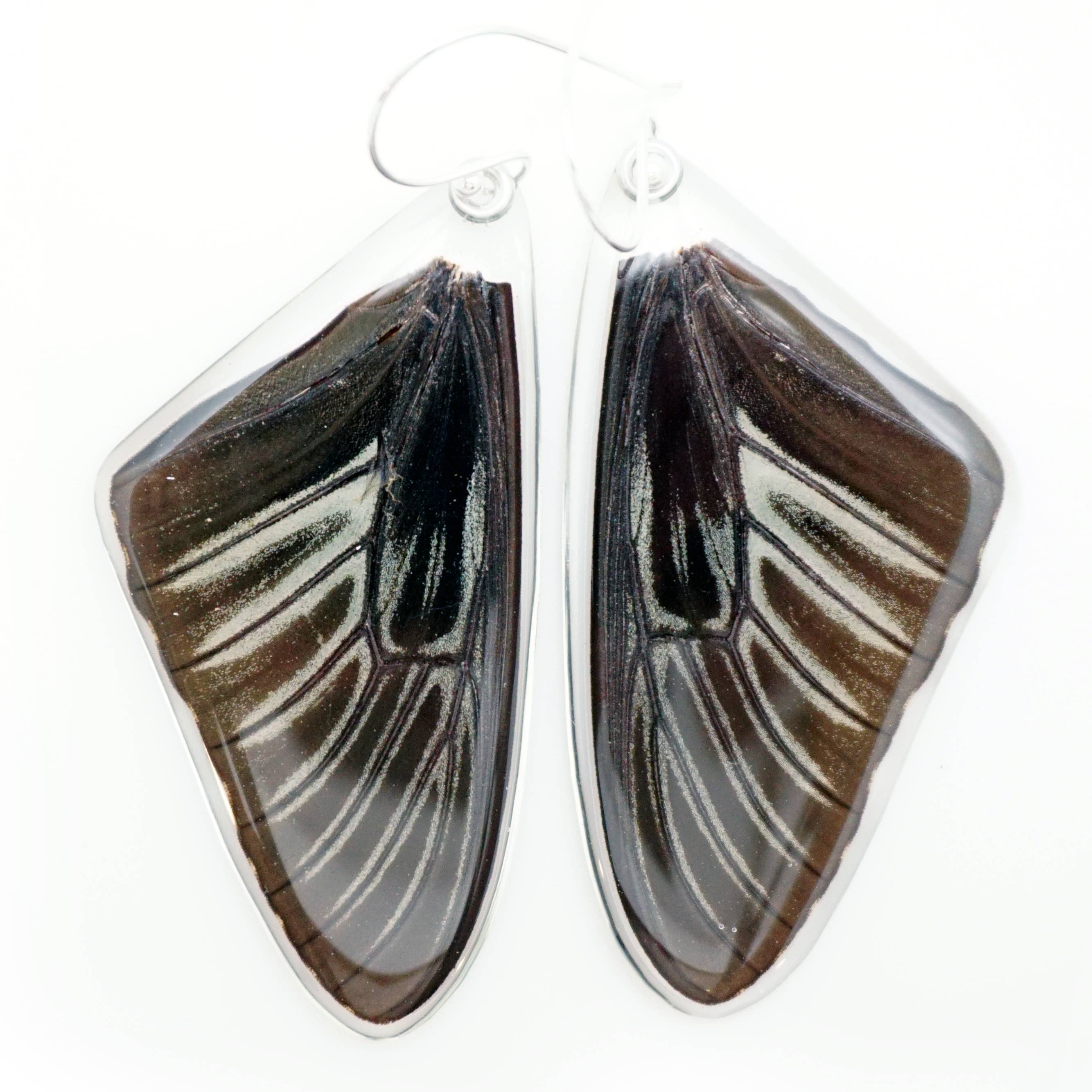 Real butterfly wings pair, whole wing, encased in resin using a proprietary process. Sterling silver earring wire, reversible!