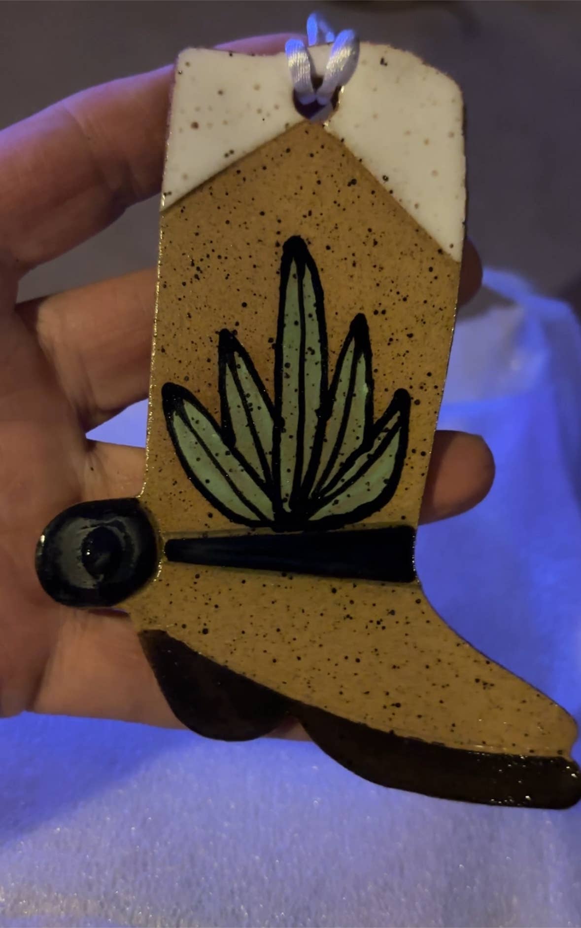 Newly designed for 2025! These ceramic boot ornaments were a huge hit last season, so now we've got new options. Choose from Cowskull, Organ Pipe, Pink Bloom, or Daisy- these sweeties are a great gift year round. ornaments measure 3.75"x4.75". Matte finish with metallic accents. Due to the handmade nature, some variations in design will occur. Cord included.