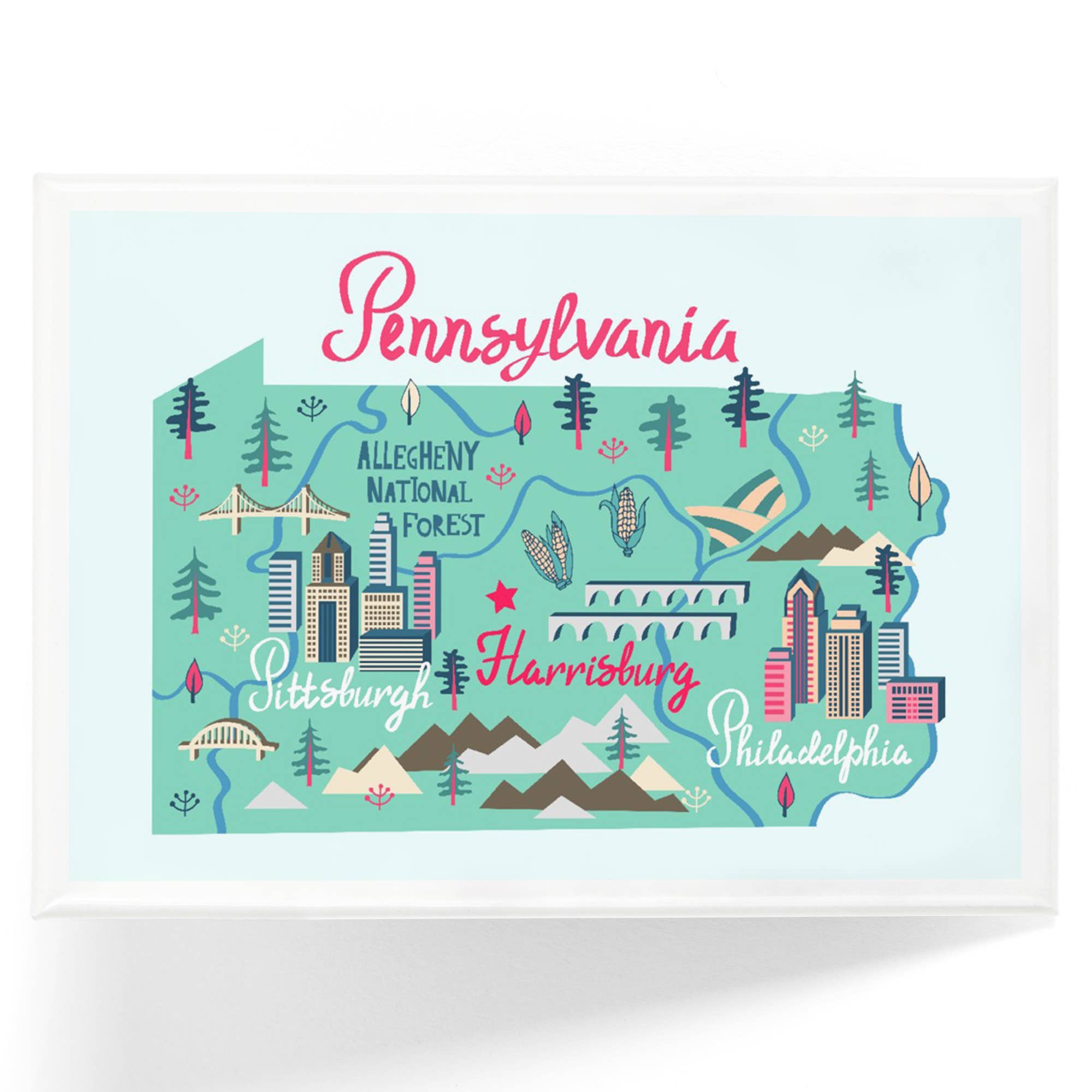 Decorative, functional, and strong magnet featuring artist's hand drawing of Pittsburgh's Monongahela Overlook. Size: 2 1/8h x 3 1/8w