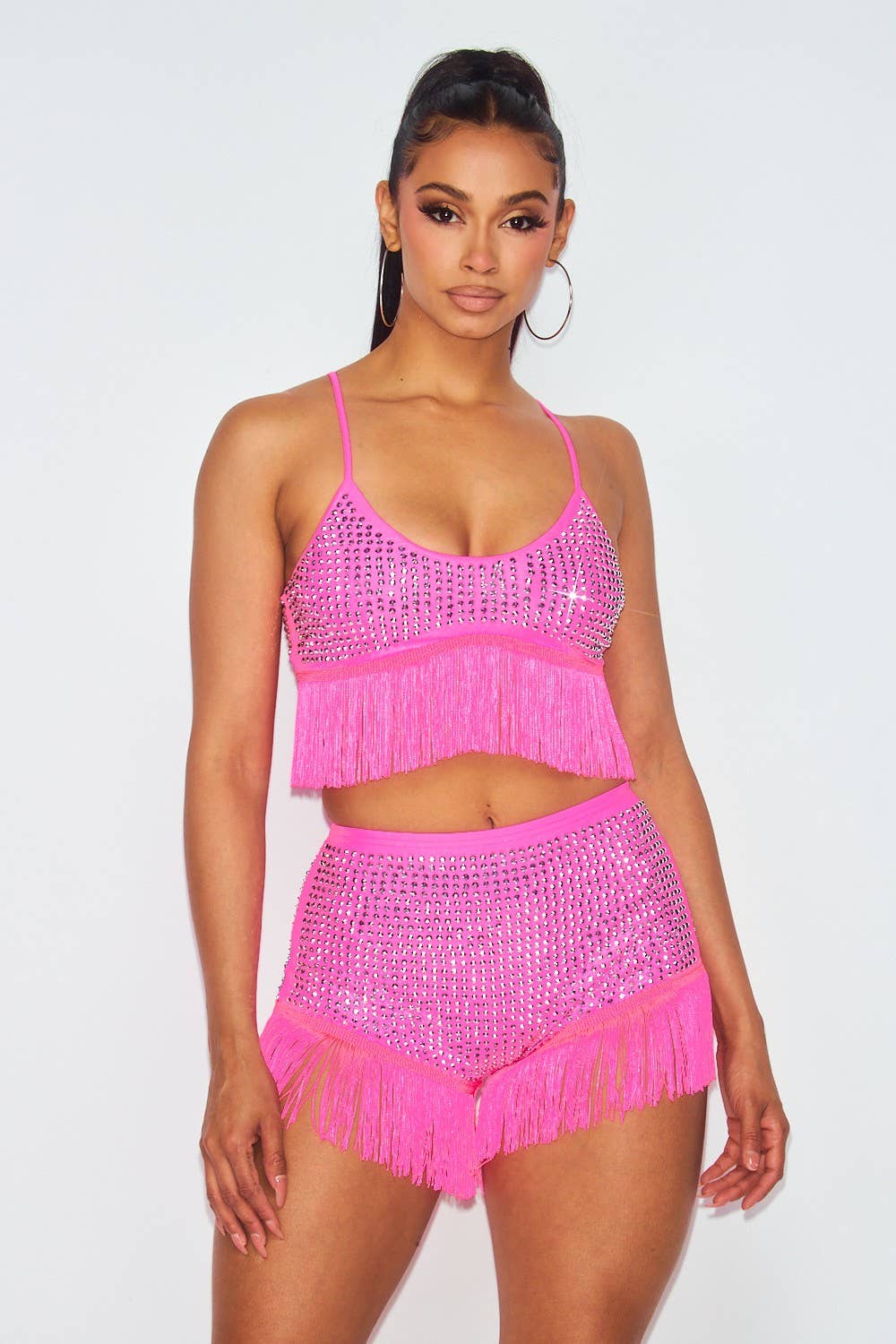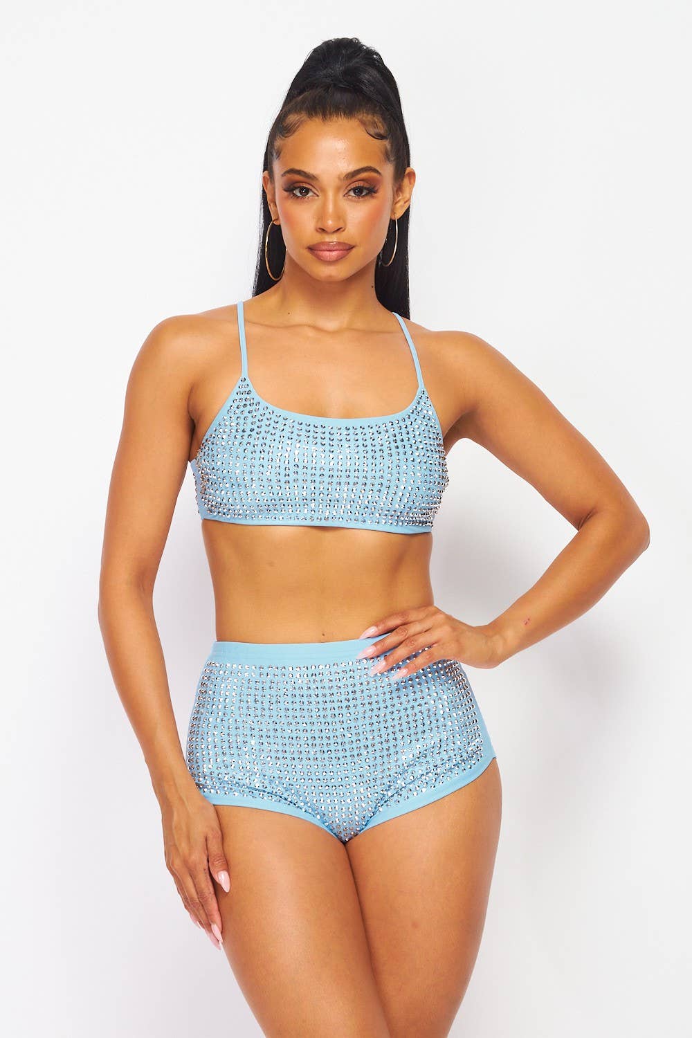 Our Butterfly Rhinestone Crop Top And Shorts Swim Set, Featuring Large Rhinestones All Over, Butterfly Design Crop Halter Top, Ties at Back, Matching High Waisted Hot Short, Stretchy, Can Be Used As A Swimsuit.