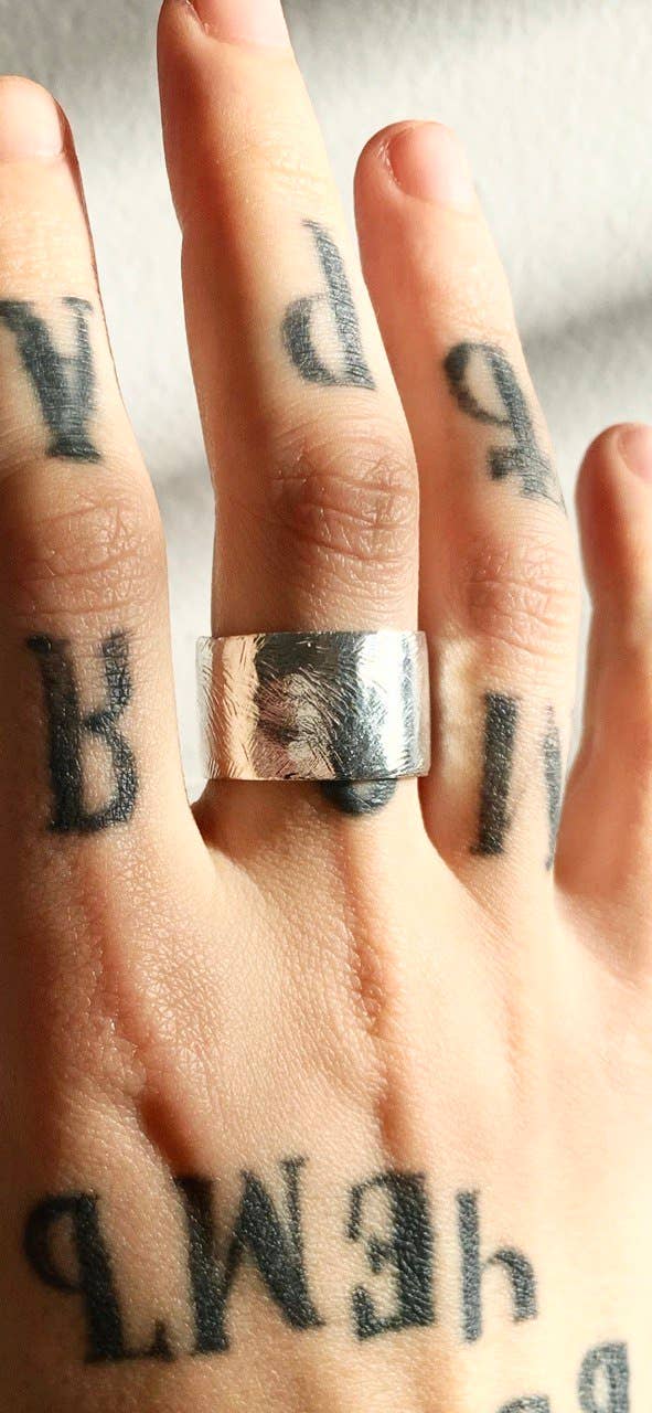 This is a fun and flirty skinny band ring hand stamped with "FUCK OFF" in cute uppercase font. It has a flat top which gives it a 90s vibe. This ring is great to wear alone or stack in multiples. ABOUT THE ITEM - Choose between 18k gold plated brass, 18k gold plated sterling silver (vermeil) or Sterling Silver (silver ring) - The vegan ink used to darken the lettering is semi-permanent. - Each ring is handmade to order for you and a little different due to the nature of hand-stamping. - For custom text (up to 11 characters or fewer), please fill in the personalization box provided CARE INSTRUCTIONS - It is advisable to remove your ring during hand washing. - It is not recommended to sleep, shower or exercise in stamped or handmade jewelry.