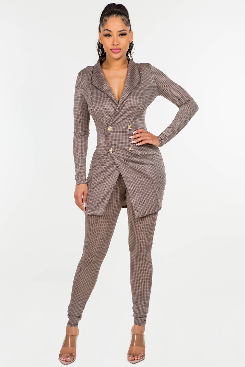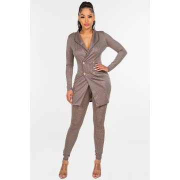 Tow tone rib fabric Long sleeve Twisted front Cut out detailed Slit open front top Wide leg pants Pull on style Stretch 78%Polyester 19%Rayon 3%Spandex Top Length : 23"(HPS) Inseam : 33" Imported