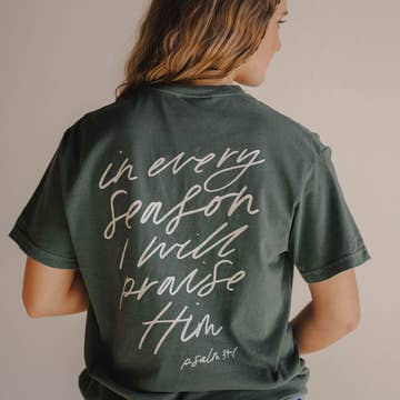 In every season, praise Him. He is with you on the mountaintop just as He is with you in the valley. He is not only the God of the good... He is also the God of the awful and everything in between. He promises that He is with you in every season and every circumstance. If you find yourself in a valley season, do not be afraid because you are not alone. Allow Him to use this time as a reminder that He goes before you and that He is your peace and comfort. The valley will not last forever, but learn to rejoice in His goodness in it just as you would on the mountain. He will lead you out, but where you are is so important. Hold fast to the truth of His word in every season and allow your confident trust in His word to carry you through every high and low. He is not just the promise maker, He is the promise keeper. I will extol the Lord at all times; his praise will always be on my lips. Psalm 34:1 Moss Tee with white ink