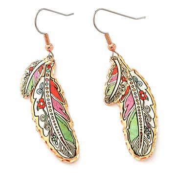 Native American and Art Deco Designs. Double Feather Copper Earrings we have designed these gorgeous handcrafted earrings in her best selling feather artwork. This floral painted feather design is handmade in two sizes and overlapped for a dramatic effect on these dangle earrings.