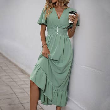 Material: 65% Polyester 35% Viscose Features: Petal Sleeve Ruffle Trim Wrap Belted Midi Dress Occasion: Casual/Daily/Outdoor/Vacation/Holiday/School/Going Out. Style # EODS510049